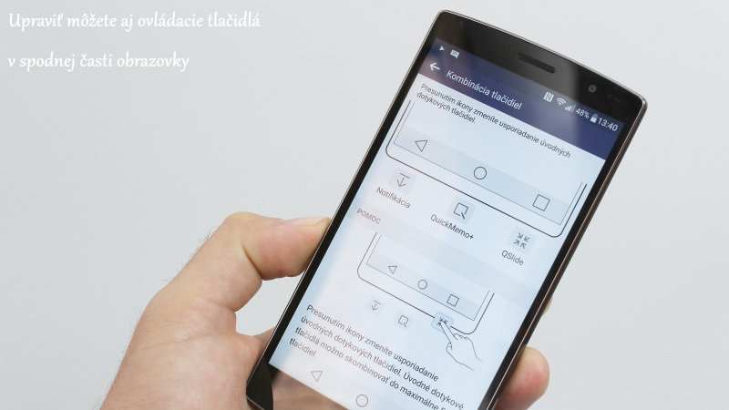 Základné ovládacie tlačidlá sú už tradične súčasťou displeja. LG opäť nezabudlo na možnosť zmeniť ich podfarbenie, na výber máte čierne a biele, a taktiež nechýba ani možnosť meniť počet a rozmiestnenie tlačidiel. K tradičným tlačidlám domov, späť a multitasking si tak môžete pridať aj tlačidlá na vysunutie hornej lišty, spustenie aplikácie QuickMemo alebo spustenie aplikácií Qslide. Ide o pár základných aplikácií, ktoré viete spustiť v zmenšenom zobrazení a meniť ich umiestnenie, veľkosť a taktiež aj priehľadnosť. Ja som využíval najmä kalkulačku a kalendár.