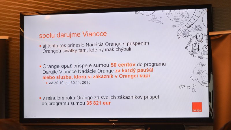 Tak ako každý rok, aj tento Vianoce nezabúda Orange ani na tých, ktorí to potrebujú. Za každú komerčnú operáciu, ktorú zákazník vykoná od 30. 10. do 30. 11. 2015, daruje operátor 0,50 eur na grantový program.