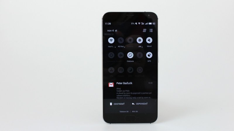 V hornej notifikačnej lište viete zobraziť aj aktuálnu rýchlosť dátového pripojenia. Okrem toho tu nájdeme percentuálny stav batérie alebo čas. Pozor však na zobrazenie lišty na zablokovanej obrazovke. Vtedy sa tu okrem známych piktogramov zobrazia aj názvy mobilných sietí, a ak máte vložené dve SIM karty, ich názvy zaberú väčšinu priestoru a pre notifikácie už miesto nezostane. A keďže Meizu MX5 ešte nevie zobraziť notifikácie na zablokovanej obrazovke, podrobnosti o zmeškanej udalosti sa dozviete až po odblokovaní zariadenia.