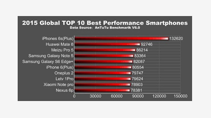 No ani výsledky AnTuTu neznamenajú, že smartfóny s nižším počtom získaných bodov sú menej výkonné. To určite nie. Pri bežnom používaní zvyčajne veľký rozdiel vo výkone nezistíte. A kto sa stal víťazom testu AnTuTu Benchmark verzie 6.0? Najnovšie Apple telefóny iPhone 6S a iPhone 6S Plus. Dvojkou sa stal nový Huawei Mate 8 a len o pár bodov za ním ostal Meizu Pro 5. Ako je známe, Apple zariadenia majú výborne optimalizovaný softvér, preto nepotrebujú tak náročnú výbavu ako Android.