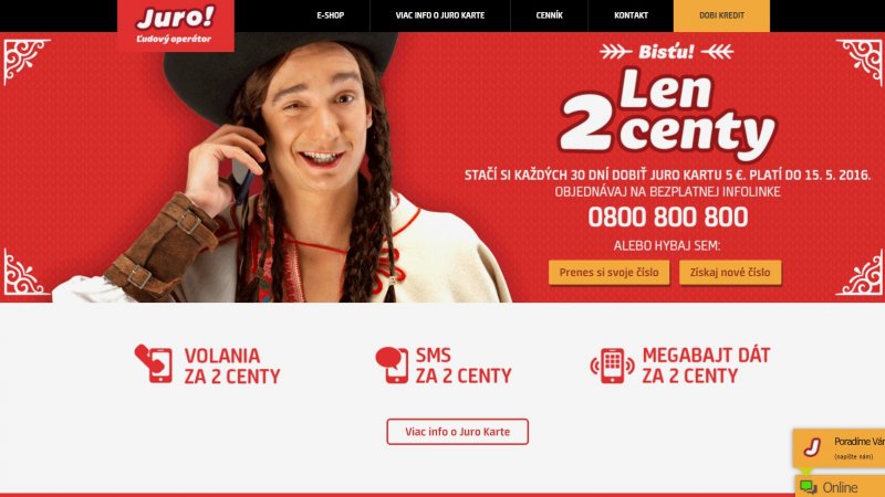 Snáď ako reakcia na štvrtého operátora, ktorý spustil svoje služby začiatkom októbra minulého roka, priviedol Telekom na svet Jura - nového virtuálneho operátora. Ľudový operátor, ako sám seba nazýva, láka na volania, SMS-kovania a dátovanie za dva centy. Cena platí nielen v sieťach SR, ale aj Európskej únie. V roamingu v krajinách EÚ zaplatíte za minútu, SMS/MMS a megabajt dát 0,04 €. Účtuje sa každá začatá sekunda odchádzajúceho hovoru. Kompletný cenník nájdete tu.