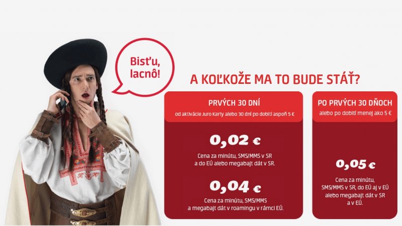 Má to však háčik. Musíte si každých 30 dní dobiť kredit sumou aspoň 5 eur. Ponuka zatiaľ platí do 15. 5. 2016. Čo bude po tomto dátume zatiaľ nevieme. Možno Juro prinesie novú ponuku a snáď aj doplnkové balíčky.