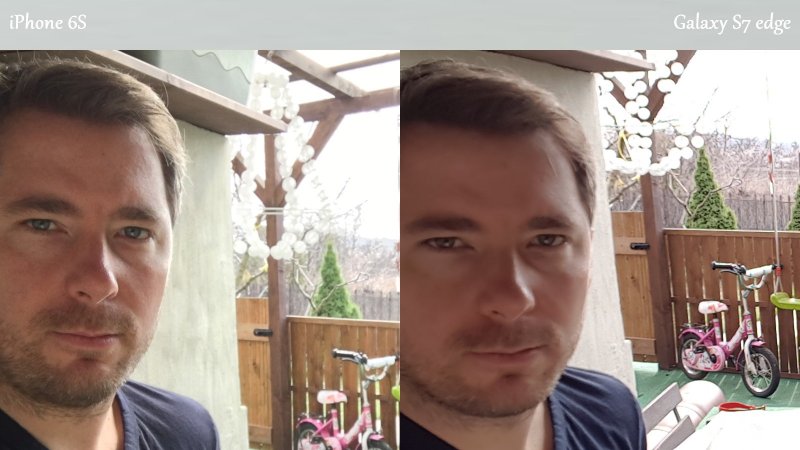 Zadné fotoaparáty ponúkajú úplne zhodné rozlíšenie snímok, a to 4032 x 3024 bodov. Predné 5 Mpix fotoaparáty sa už v konkrétnych rozmeroch mierne líšia. Oveľa dôležitejší je však rozdiel v ohniskovej vzdialenosti. Ak čo najviac natiahnem ruku s iPhonom 6S, zmestím sa do záberu ja a možno ešte štyria kamoši. Ak potom vezmem Galaxy S7 a spravím to isté, môžeme sa naraz odfofiť aj všetci spolužiaci na stretávke zo strednej. Obrazne povedané. Je to fakt veľký rozdiel. Tváre však budú ostrejšie na iPhone, Samsung zase skôr dbá na ostré pozadie. Ak sa teda s frajerkou usmievate do prednej kamery Samsungu, bude ostrý skôr bojnický zámok za vami, ak do iPhonu, budete mať ostrejšie tváre vy, ale zámok bude na tom už trochu horšie. Je už len na vás, čo preferujete.