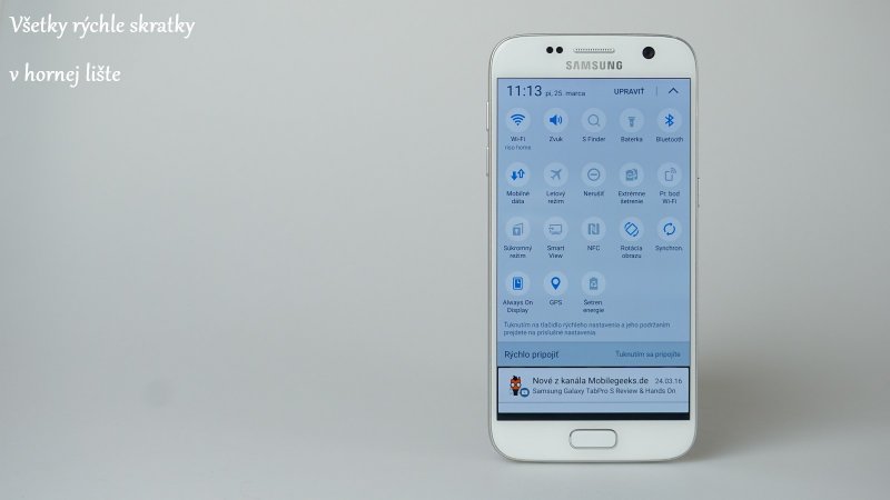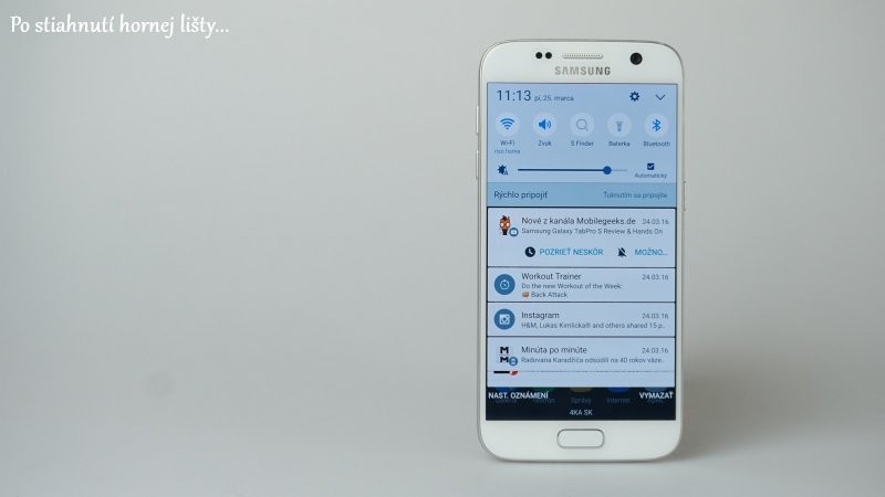 Vyhľadávať môžete aj z výsuvnej hornej lišty pomocou funkcie S Finder, vtedy bude prehľadávaný celý obsah telefónu. Informačná lišta zobrazuje nielen notifikácie a zmeškané udalosti, ale tradične aj ikony s rýchlym prístupom k aktivácií alebo nastaveniam rôznych funkcií. Vyberať môžete z osemnástich ikon, ich umiestnenie v hornej lište sa dá meniť. K úplnej ponuke ikon sa dostanete dvojitým (opakovaným) potiahnutím prsta zhora nadol alebo rovno potiahnutím lišty dvomi prstami. Nájdeme tu aj automatickú reguláciu jasu a rýchle pripojenie k známym zariadeniam pomocou Bluetooth alebo Wi-Fi (televízory, slúchadlá, iné mobily a podobne).