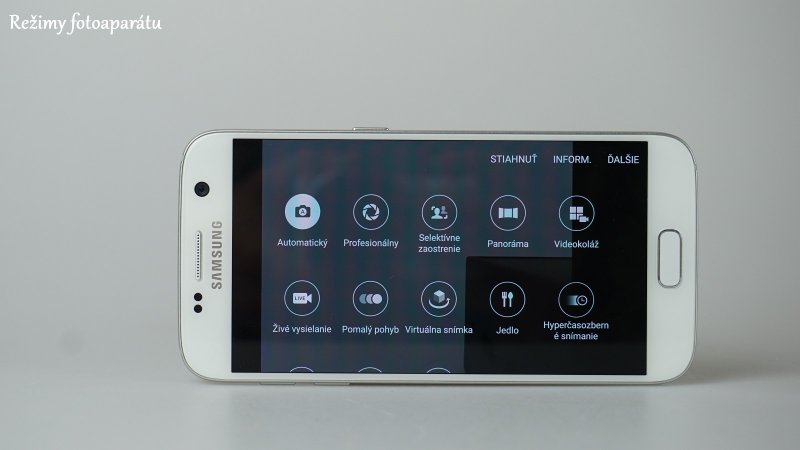 Fotoaparát spustíte buď klasicky ťuknutím na ikonu na domácej obrazovke, alebo už spomínaným, veľmi návykovým, dvojitým stlačením tlačidla Domov. Spustenie fotoaparátu je bleskové. Na pravej strane displeja je vstup do galérie, ikona pre spustenie záznamu videa, pod ňou softvérová spúšť fotoaparátu, prepínač na prednú kameru a vstup do ponuky režimov. Samsung ponúka široký výber, pokiaľ vám niektorý chýba, môžete ho pohľadať v obchode Galaxy Apps a stiahnuť. Odkaz na stiahnutie ďalších režimov nájdete priamo v menu. Ľavá strana patrí v aplikácii Fotoaparát nastaveniam, ku ktorým sa dostanete ťuknutím na malú šípku hore. Rozbalí sa ponuka s rýchlym prístupom k rôznym efektom, HDR funkcii (môže byť zapnuté, vypnuté alebo v automatickom režime), potom tu je časovač s možnosťou nastavení intervalu v rozsahu dve sekundy, päť sekúnd, desať sekúnd alebo si tu zapnete aj snímanie troch snímok naraz.