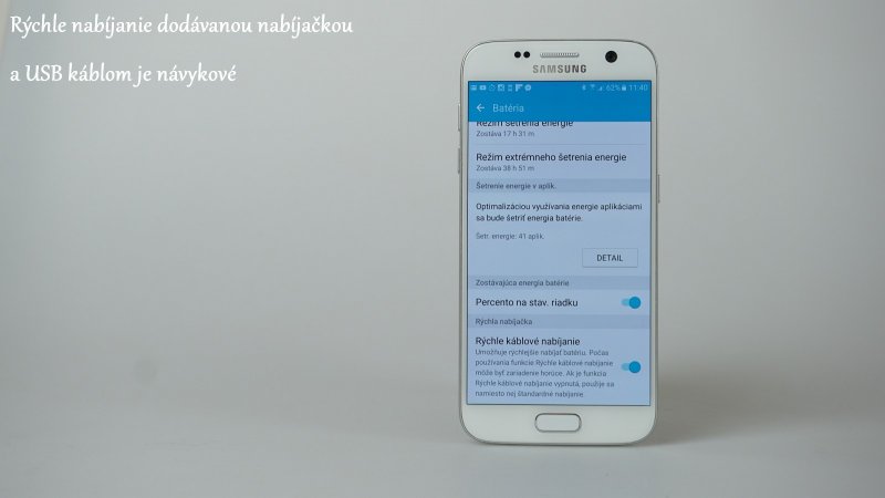 Kapacita batérie sa v S7 zvýšila oproti S6 o 450 mAh, čo by malo spolu s vylepšenou správou batérie a menej energeticky náročným procesorom predĺžiť oproti predchodcovi výdrž na jedno nabitie. Neviem, či som niekde robila chybu, ale netrúfla som si po obede opustiť byt bez externej nabíjačky. Ráno okolo ôsmej som vytiahla telefón z nabíjačky, používala ho podľa zvyklostí a hlavne bez obmedzení, čo zahŕňa niekoľko hovorov, zapnuté Wi-Fi, GPS, Bluetooth, mobilné dáta, synchronizácia s Gmailom, Facebookom, na pozadí bežal Messenger, sem tam som použila niektorú aplikáciu, občas Waze (krátke trasy) a po obede som nikdy nemala viac než 30 % batérie, a to ma čakalo ešte niekoľko hodín s Galaxy S7 mimo domu. Pre niektorých možno úspech, no ja som z iPhone 6S Plus zvyknutá na to, že mi batéria vydrží aspoň jeden pracovný deň.