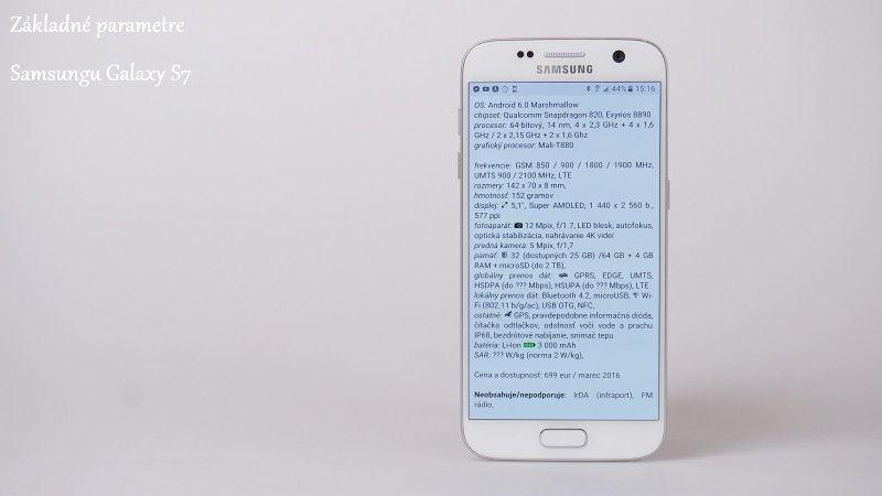 Základné info: Samsung Galaxy S7 (SM-930F)Smartfón ponúka rovnaký 5,1” displej ako vlanajší model, dostal však 4 GB RAM, 12 Mpix fotoaparát s rekordnou svetelnosťou objektívu a optickou stabilizáciou, odolnosť voči vode či 3 000 mAh batériu. |