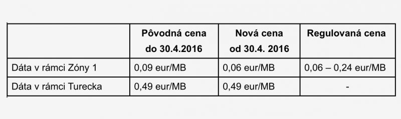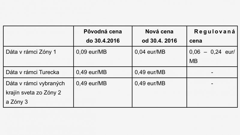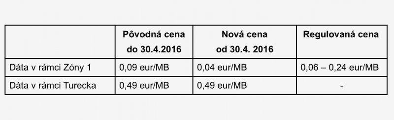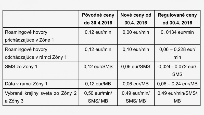 Od soboty 30. 4. 2016 vstupuje do platnosti nová cenová regulácia Európskej únie, ktorá upravuje poplatky za roamingové služby. Výsledné ceny telekomunikačných a internetových služieb poskytovaných v zahraničí sa budú odlišovať v závislosti od toho, aký paušál používa zákazník doma. K základným jednotkovým cenám v domácej sieti sa pripočítava regulovaný roamingový príplatok, ktorý je nasledovný: