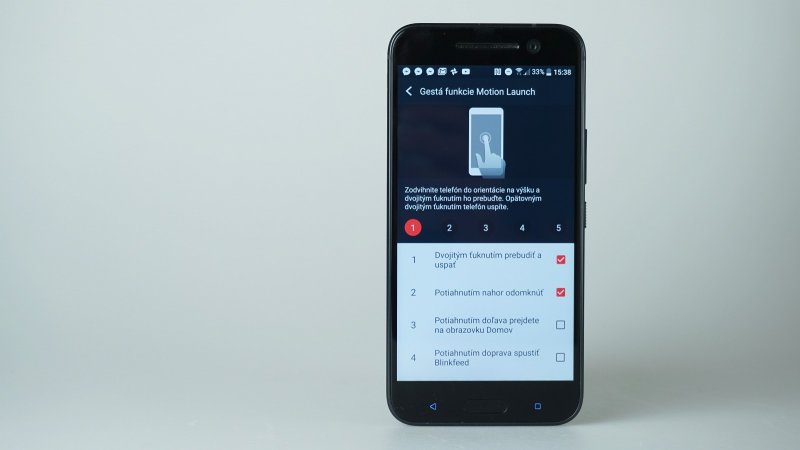 Hoci už výsledná reprodukcia nepatrí k najlepším ani najhlasnejším na trhu, zrejme budete spokojní. Softvérové vylepšovanie zvuku BoomSound možno vypnúť až po pripojení (akýchkoľvek) slúchadiel, pri hlasitom prehrávaní iba prepínate medzi režimom Hudba a Kino. Tutoriál v Sense umožní vyladiť si vlastný audioprofil zakliknutím odpovedí na sériu otázok o hudobných preferenciách alebo počúvaním skúšobných frekvencií.