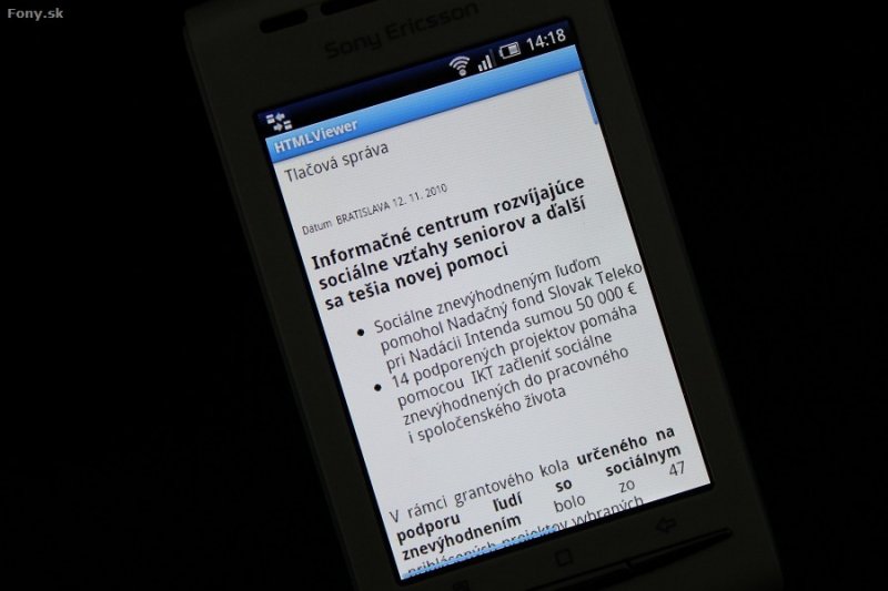. Ten dokáže pracovať aj s viacerými kontami naraz. Klient je rýchly, v spojení s HSDPA je práca s e-mailami blesková. Páčilo sa mi zobrazovanie miniatúr fotografií pri Google kontaktoch. Xperia X8 si neporadí s dokumentami. Pre ich čítanie je nutné doinštalovať externú aplikáciu, napríklad Documents To Go. je už tradične na vysokej úrovni. Dokáže pracovať s viacerými oknami naraz, neporadí si však s Flashom. Pri prehliadaní nie je možné využiť multitouch. Prehliadač si poradil ako s webovými, tak aj s wapovými stránkami. Možnosti prispôsobenia webového prehliadača úplne chýbajú. Pre náročnejších odporúčame stiahnuť kvalitnejší prehliadač, ako napríklad Operu Mini, Operu Mobile 10 beta či Firefox 4, momentálne tiež v beta verzii. V Markete sú dostupné bezplatne. Na prenos dát môžete využiť všetky dostupné technológie, od zastaralého GPRS až po rýchle HSPA. Fanúšikovia bezplatného prístupu na internet isto ocenia zabudované Wi-Fi. Na spojenie s počítačom či iným blízkym zariadením poslúži microUSB konektor alebo Bluetooth.Zabudovanému kalendáru chýba lišta s aktuálnymi dennými udalosťami. V nastaveniach možno zvoliť vlastný tón upozornenia. Pozor, ten pri upozornení zazvoní iba raz a nie opakovane! Akékoľvek ďalšie nastavenia chýbajú! Pri zadaní Google konta sa údaje z kalendára automaticky synchronizujú s vaším Google Calendarom. Tlačidlo späť kalendár nevypne, ale vráti vás o úroveň vyššie. Budíkov si môžete vytvoriť viacero. Pri aktivovaní budenia telefón nezobrazí informáciu, koľko času ostáva do zobudenia. Z ostatnej funkčnej výbavy nájdete v ponuke aj kalkulačku s pohodlným ovládaním, vedecké funkcie a pamäťové možnosti jej, žiaľ, chýbajú. Prítomná je aj sada Google aplikácií (Gmail, Gmaps, Gtalk), YouTube, Facebook klient, prístup k Marketu a štyri jednoduché hry.