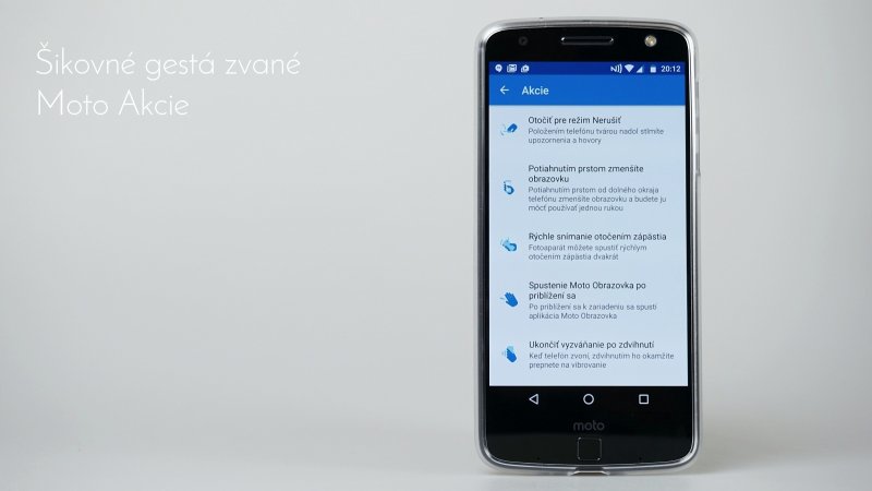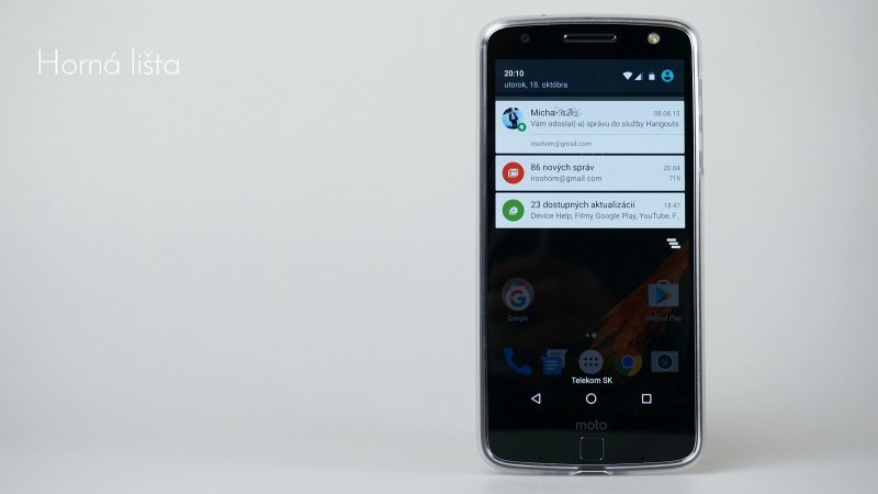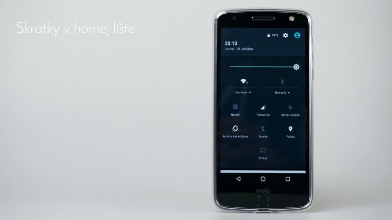 Motorola po odkúpení Googlom používala veľmi jemné nadstavby založené na čistom Androide, kde pridali iba zopár svojich funkcií ako Moto displej a pod. Som rád, že to tak ostalo aj po prechode pod Lenovo. Zákazníci sa tak stále dočkajú aktualizácií na novšie verzie medzi prvými na svete. Okrem dostupnosti aktualizácií je nespornou výhodou aj rýchlosť nadstavby. Nestretol som sa so sekaním, zamŕzaním ani reštartami. Pridanou hodnotou od Moto je už spomínaný Moto displej, akcie a hlas. Druhé spomenuté ponúka rôzne gestá na zjednodušenie ovládania, napríklad zapnutie batérie po dvojitom potrasení alebo vypnutie zvonenia, keď telefón zdvihnete. Moto hlas bohužiaľ nie je dostupný v slovenskom jazyku. Vopred nainštalovaná je aj aplikácia na ovládanie Moto Mods. Zvyšok nadstavby je v podstate čistý Android, takže tomu zodpovedá aj zážitok z používania. Jediná vec, ktorá mi prekážala, bola nemožnosť nastaviť funkcie a poradie navigačných tlačidiel na displeji, tlačidlo späť som zvyknutý používať napravo.