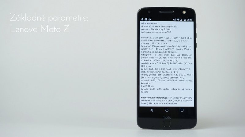 Základné info: Lenovo Moto Z (XT1650)Špičkovo vybavený top model s prídavnými modulmi prináša ľahkú a len 5 mm tenkú konštrukciu, zaujímavý dizajn, 5,5'' QHD AMOLED displej, Snapdragon 820, 13 Mpix fotoaparát s laserovým zaostrovaním a OIS, USB-C, ktorý poslúži aj ako audio jack a 2 600 mAh batériu s rýchlym nabíjaním. |