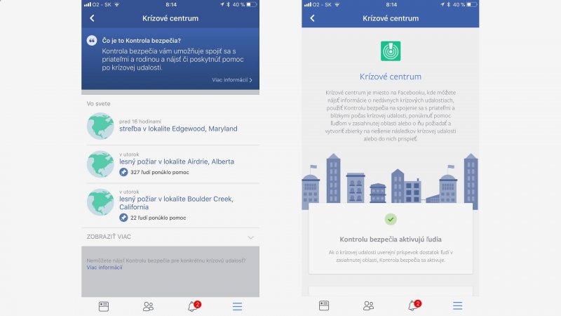Druhou novinkou je Krízové centrum. Nájdete tu informácie o nedávnych krízových udalostiach vo svete. Pokiaľ sa niekto z vašich priateľov nachádza v postihnutej oblasti, môžete použiť Kontrolu bezpečia na overenie, že je v poriadku.