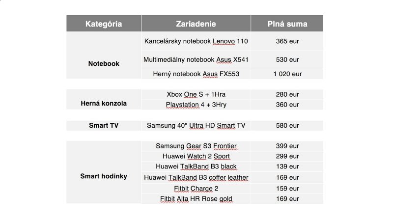 Okrem štandardných tabletov a mobilných telefónov si môžu vybrať aj kancelárske, multimediálne a herné notebooky značky Lenovo a Asus, herné konzoly Xbox One S a Playstation 4, smart TV od Samsungu a tiež šesť modelov inteligentných hodiniek a smart náramkov.