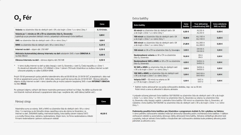 K predchodcovi O2 Fér stále máte na výber z niekoľkých extra balíčkov, no 30-eurový s neobmedzenými volaniami do všetkých sietí v SR a do celej Európskej únie nenájdete. Rovnako bol zrušený balík s neobmedzenými SMS-skami do sietí SR a EÚ za 6 eur. V ponuke ostali len neobmedzené volania na čísla O2 za 10 eur a neobmedzené SMS a MMS správy do siete O2 za 4 eurá.