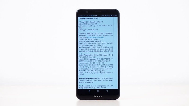 Základné info: Honor 7XDual SIM android s 5,9'' Full HD+ displejom s pomerom strán 18:9, čipsetom Kirin 659, až 128 GB pamäťou, duálnym 16 Mpix fotoaparátom a 3340 mAh batériou. |