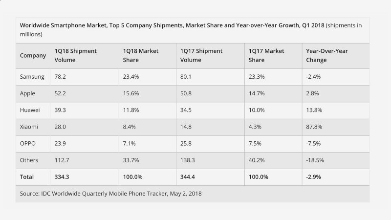 Lídrom ostáva s dodávkou 78,2 miliónov kusov smartfónov Samsung, no trhový podiel mu medziročne klesol o 2,4 %. Apple si polepšil o 2,8 %, keď v prvom kvartáli 2018 dodal 52,2 miliónov iPhonov, čo je o 1,4 mil. kusov viac než pred rokom. Tretím najväčším dodávateľom ostal Huawei. Medziročne dodal o 13,8 % zariadení viac (39,3 mil.) a patrí mu 11,8 % trhový podiel.