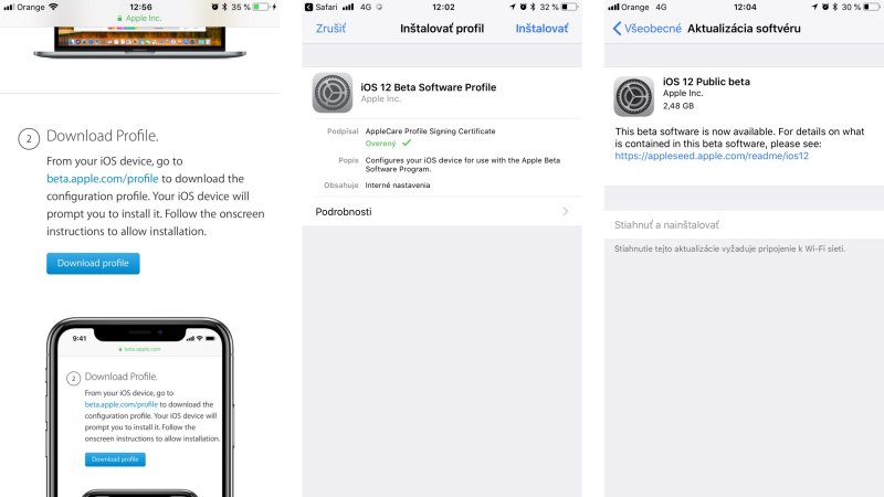 Pre prístup do programu označeného ako public beta nepotrebujete platený vývojársky účet, do svojho zariadenia si však budete musieť stiahnuť špeciálny aktualizačný profil. Najľahšie tak spravíte cez Safari v iPhone alebo iPade vyplnením vášho Apple ID na stránke beta.apple.com. Profil nainštalujte, nechajte iPhone alebo iPad reštartovať a následne by sa vám mala aktualizácia na iOS 12 automaticky ponúknuť v Nastaveniach, karte Všeobecné -> Aktualizácia systému.