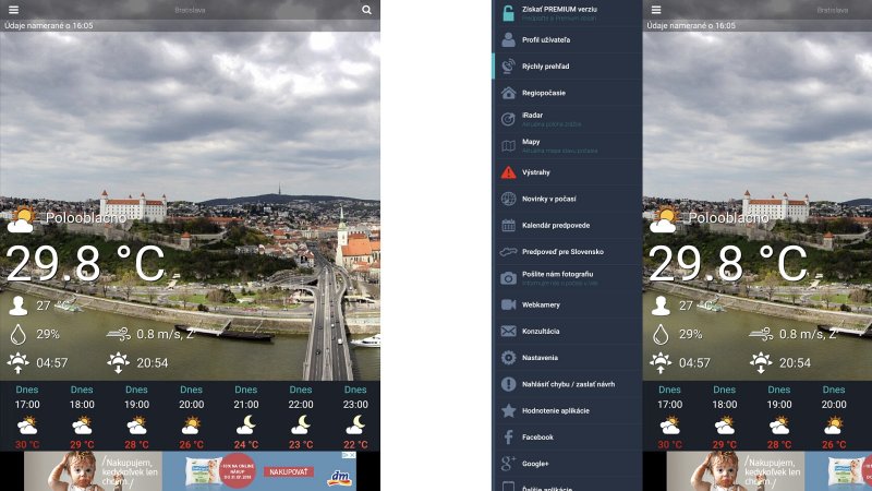 V Premium verzii vás nebudú otravovať reklamy a nájdete tu prehľadné Grafy slovenských miest s vývojom teploty, tlaku, vetra a zrážok. Na blížiace sa nebezpečné meteorologické javy upozornia Výstrahy, môžete si pozrieť počasie v európskych mestách a v rýchlom prehľade máte k dispozícii viac obrazoviek.
