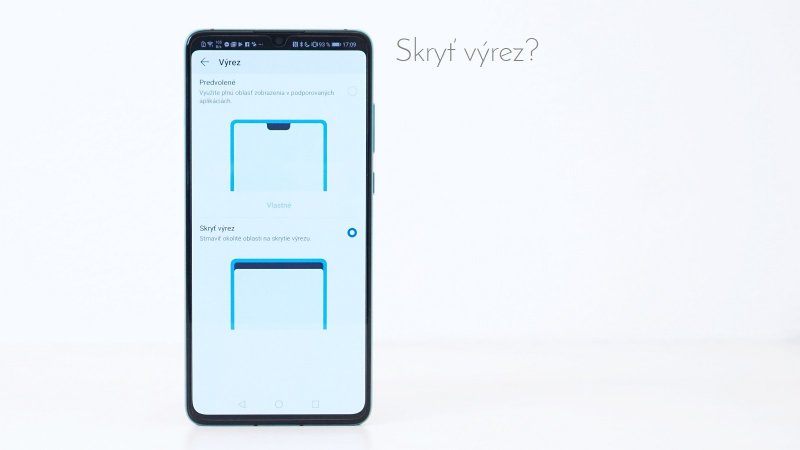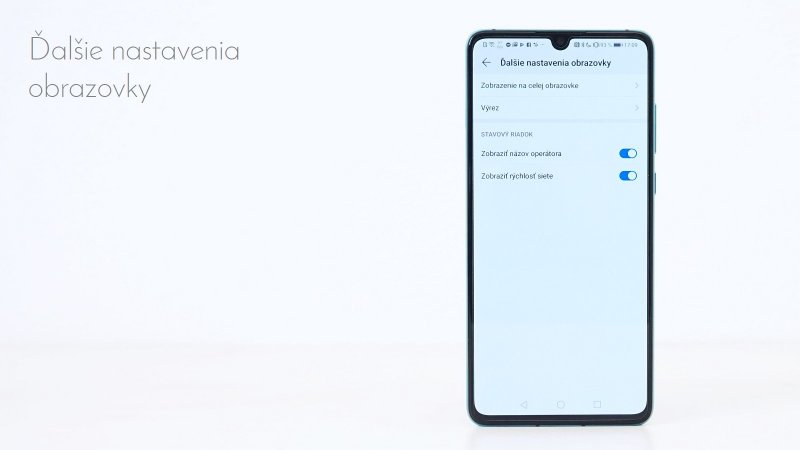 V časti nastavení obrazovky sa dá zobraziť aj údaj o aktuálnej rýchlosti prenosu dát v stavovej lište alebo zapnúť akési fejkové "skrytie" výrezu okolo prednej kamery. Udeje sa samozrejme iba zmena pozadia na čiernu farbu na pár milimetroch v hornej časti displeja. No vyzerá to nevábne. Na výrez si isto zvyknete za pár hodín a my už ho na mobiloch skôr vítame.