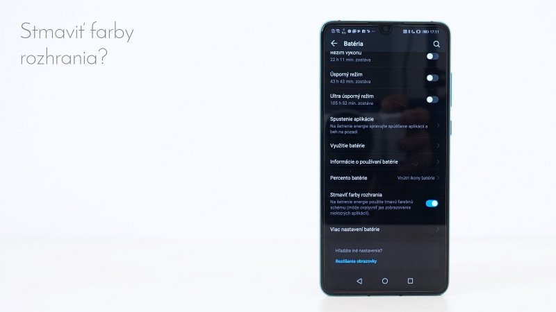 Za zmienku stojí možnosť Stmaviť farby rozhrania v nastaveniach batérie. Prostredie oblečie do čierneho kabáta, ktorý by mal byť pri OLED displejoch energeticky menej náročný. Je zaujímavé, že Huawei nehrá na podobné noty aj pri výbere tapety pozadia a naďalej ponúka žiarivé pastelové farby. Čierne pozadie si samozrejme môžete nastaviť sami.