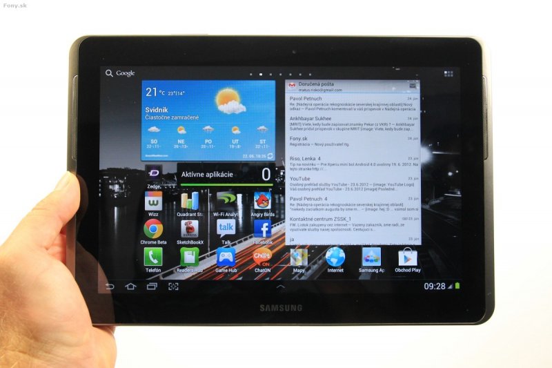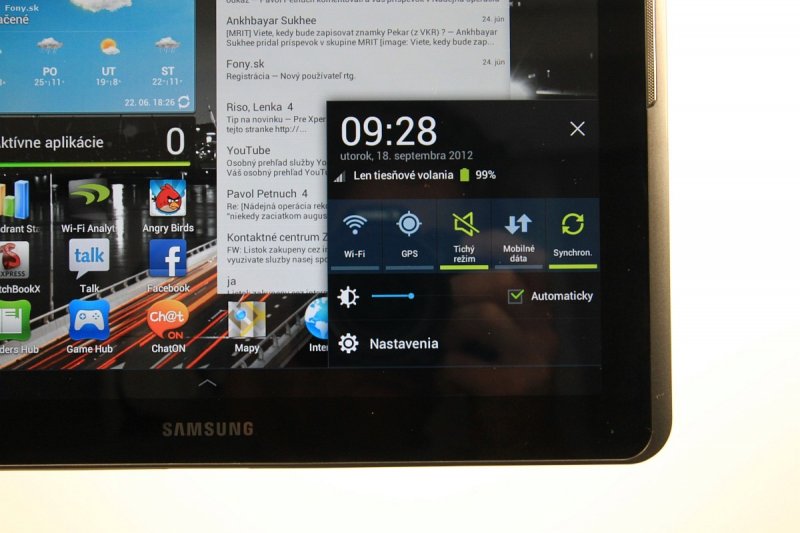 Dušou zariadenia je OS Android vo verzii 4.0 (Ice Cream Sandwich). Potiahnutím prsta po zablokovanej obrazovke sa dostávam k domácim obrazovkám a ich maximálny počet sa zastavil na čísle sedem. Vďaka veľkému displeju a Androidu 4.0 bola návšteva menu skôr výnimočnou udalosťou. Na hlavnej obrazovke mi nesmel chýbať widget s počasím od Samsungu, prehľadný zoznam prijatých e-mailov a widget s informáciou o počte spustených aplikácii. Tiež od Samsungu. Zvyšný priestor som vyplnil skratkami najpoužívanejších aplikácií. Bohato využiteľnú plochu prednej steny ešte dopĺňa lišta v spodnej časti. V ľavej časti sú to tradičné ovládacie prvky prostredia, medzi ktorými nechýba ani možnosť zhotovenia snímky obrazovky, šípka v strede zobrazí ďalšiu ponuku aplikácií a v pravej časti nájdeme informácie o čase, intenzite signálu a kapacite batérie. Dotykom do tohto priestoru sa vysunie lišta s deviatimi skratkami nastavení, rýchlym prispôsobením jasu a notifikáciami.