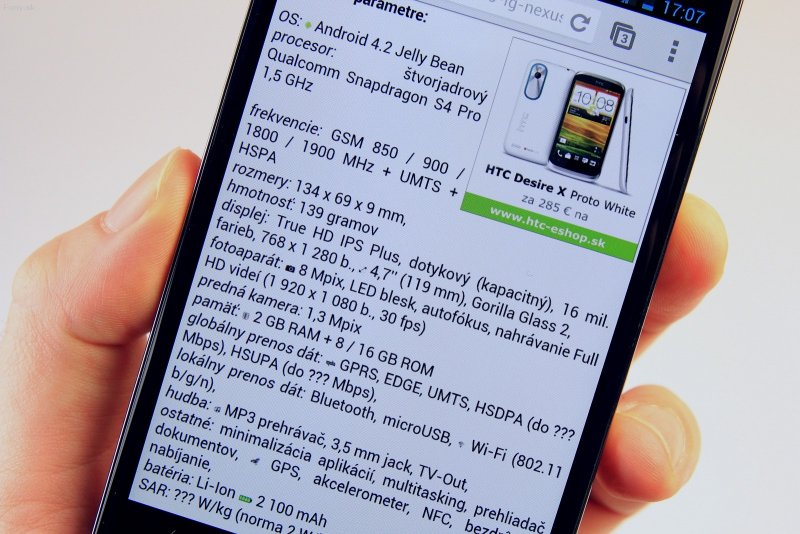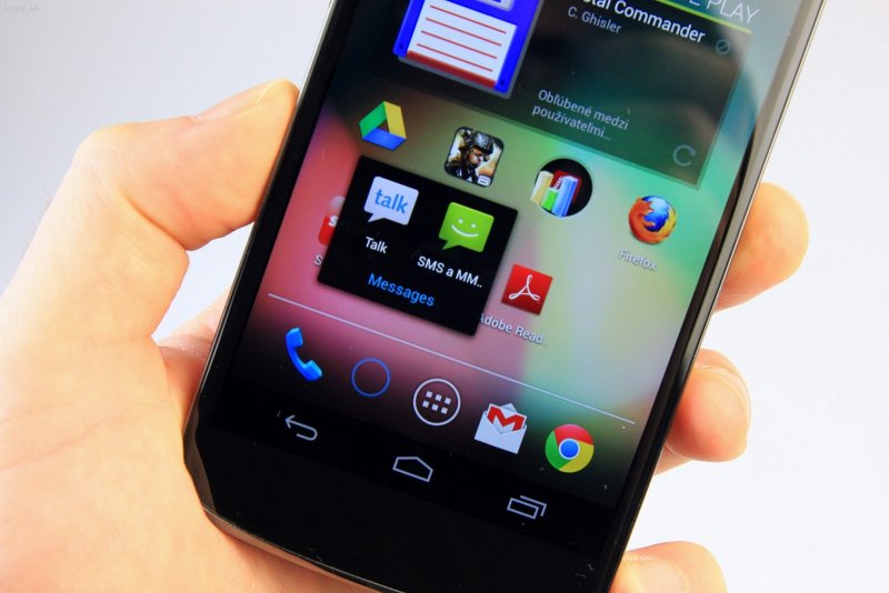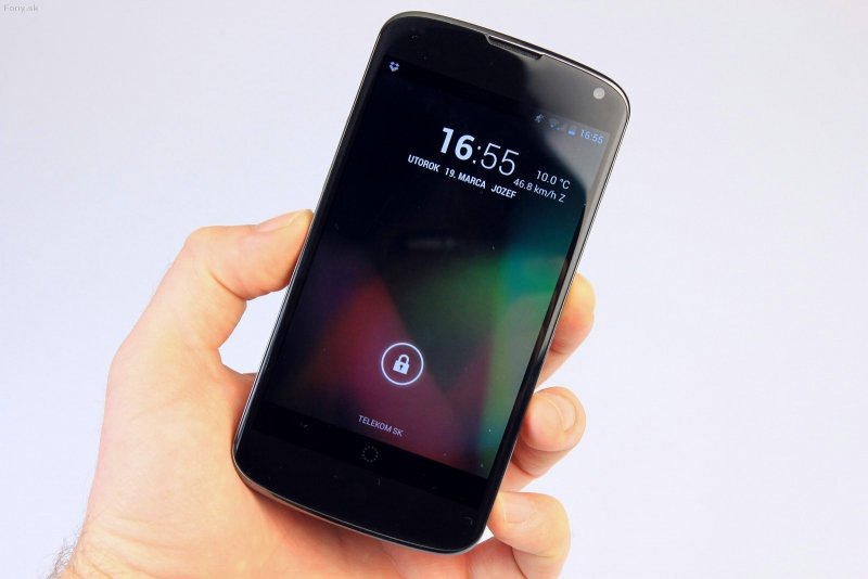 S displejom som bol veľmi spokojný. IPS panel ponúka verné farby a výborné pozorovacie uhly. Ak aj vy patríte k tým, ktorí farby AMOLEDu od Samsungu považujú za presýtené, s IPS budete určite spokojní. Kombináciu 4,7-palcového displeja a HD rozlíšenia považujem za ideálnu. Telefón nie je príliš veľký a Full HD rozlíšenie je podľa mňa v telefónoch s takýmito uhlopriečkami zbytočnosťou. Nexus je jasným dôkazom toho, že na pohodlné prezeranie webu, sledovanie filmov a prezeranie galérie je HD úplne postačujúce. O automatickú reguláciu jasu sa stará senzor nad displejom. Tu ešte nájdete predný 1,3 Mpix fotoaparát, senzor priblíženia a pochopiteľne slúchadlo, ktoré prekvapilo hlasitosťou a pri maximálnej úrovní som mal niekedy pocit, že mám zapnutý reproduktor. V rušnejšom prostredí by nemal byť problém počuť osobu na druhej strane. Podobne ako u Galaxy Nexus sa telefón ovláda výhradne pomocou displeja. Operačný systém od verzie 4.0 má v sebe zahrnuté softvérové tlačidlá, ktoré zastupujú tie fyzické pod displejom. Pod displejom tak nájdeme iba informačnú LED diódu, podobne ako v Galaxy Nexus. Jej aktivitu som si však málokedy všimol. Je malá a nevýrazná. Oznámi iba zmeškané udalosti. Na indikáciu slabej batérie alebo nabíjania zabudnite.