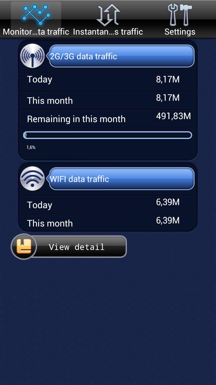 Ďalšou vybranou aplikáciu je DataTrafic Monitor. Náročnosťou a využitím je jednou z tých jednoduchších. Svoj účel však spoľahlivo splní. Sledovať môžete spotrebu dát cez mobilnú sieť alebo Wi-Fi. Navyše môžete vidieť spotrebu jednotlivých aplikácií. Po kliknutí na detail vidíte, koľko daná aplikácia spotrebovala dát.