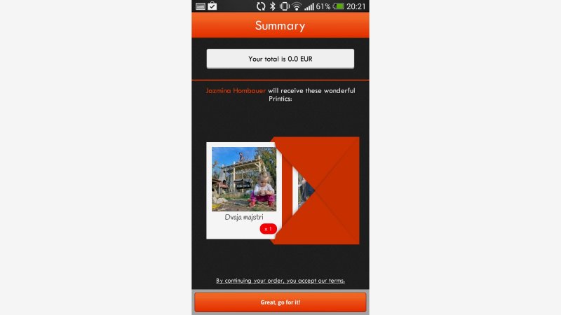 Každá snímka je síce spoplatnená sumou 0,79 €, ale Printic mi neustále e-mailom posiela nejaké zľavy. Už prvých 50 centov môžem na zásielke ušetriť zdieľaním správy na facebooku, twitteri či prostredníctvom SMS. Príjemca vašej zásielky zase dostane zľavový kód na dve fotografie zadarmo, aspoň tak tomu bolo v našom prípade.