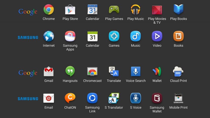 Veľkým problémom majú byť aj aplikácie, ktoré Samsung do svojich telefónov inštaluje. Používatelia v menu po prvom zapnutí telefónu okamžite nájdu napríklad chatovací program ChatON, prekladač S Translator alebo hlasový asistent S Voice. Tieto služby sú pritom priamou konkurenciou Hangouts, Google Translatoru alebo Google Now. Podľa výskumu ABI Research až 25 % predaných androidov v poslednom Štvrťroku nemá vôbec nainštalované služby Google Play. Týka sa to najmä Číny (ktorá je zároveň najväčším trhom; treba však priznať, že miestna vláda viaceré služby Googlu blokuje).