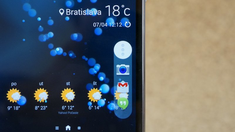 Naľavo od fyzického tlačidla je ďalšia novinka. Dotykové tlačidlo na vyvolanie kontextovej ponuky nahradilo tlačidlo spustených aplikácií. Kontextovú ponuku zobrazíte jeho dlhším podržaním. Napravo je tradičná šípka späť, ktorej dlhším podržaním spustíte funkciu Viacero okien.