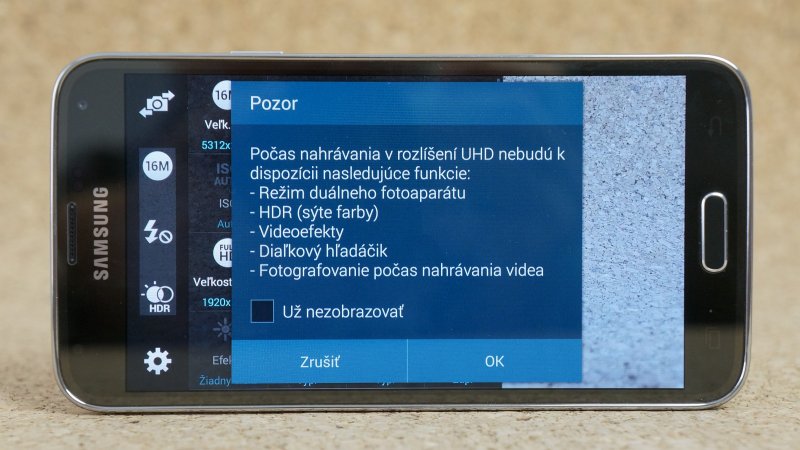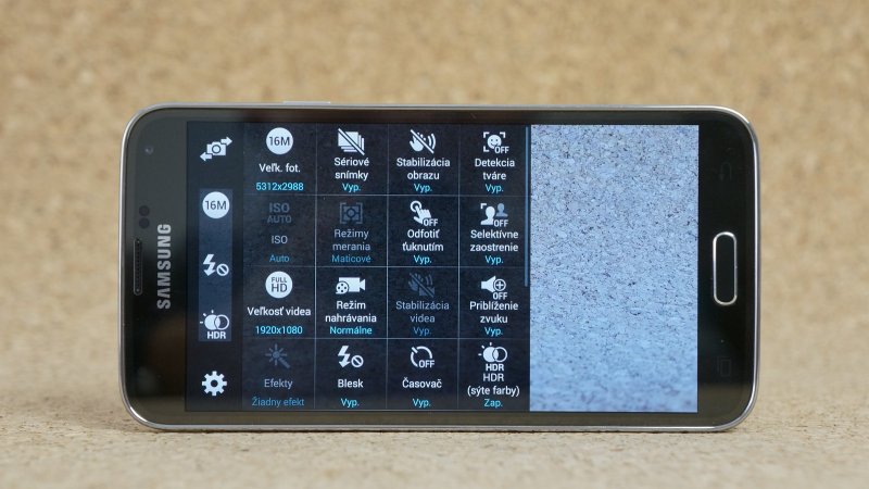 Galaxy S5 sa môže pochváliť aj natáčaním videí v UHD (4K) rozlíšení. Ak sa rozhodnete pre Full HD a nižšie rozlíšenie, v ľavej časti sa sprístupní režim HDR videa. V nastaveniach ešte nájdete spomalený a rýchly režim nahrávania videa.