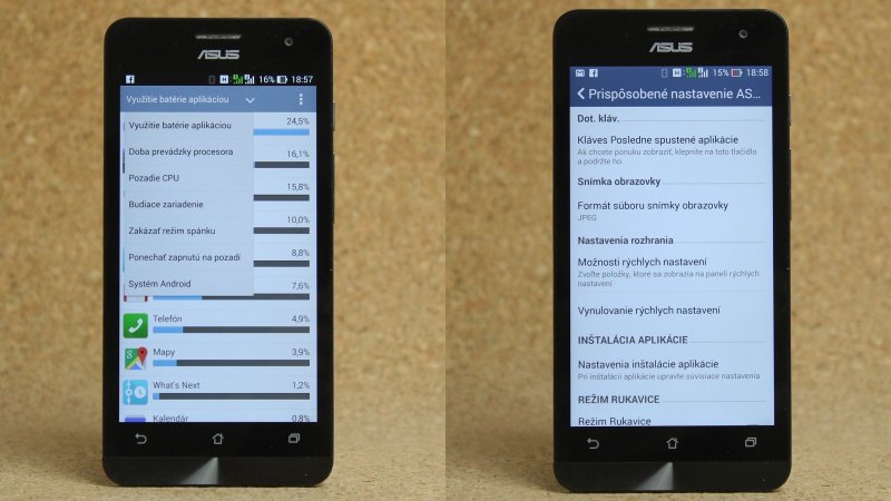 ASUS je asi najznámejším používateľom chipsetov od Intelu a rozhodol sa preň aj v prípade modelu ZenFone 5. V útrobách zariadenia nájdeme chipset Atom Z2580, ktorý pozostáva z dvojjadrového procesora s taktom 1,6 GHz a grafického procesora PowerVR SGX 544MP. Výkonovo by sme ho mohli priradiť k Snapdragonu 400 od Qualcommu, ktorý nájdeme vo väčšine smartfónov tejto cenovky. K výkonu nemám žiadne výhrady. Prehrávanie videí v 720p kvalite bolo plynule, taktiež aj hranie náročnejších hier. Som rád, že sa výrobca neulakomil na 8 GB internú pamäť a ponúka jej dvojnásobok. Presnejšie 12,27 GB, zvyšok si uchmatol systém. Prostredníctvom slotu pre microSD kartu si môžete pamäť rozšíriť o ďalších až 64 GB a určite sa zíde aj možnosť presúvať aplikácie na microSD kartu.