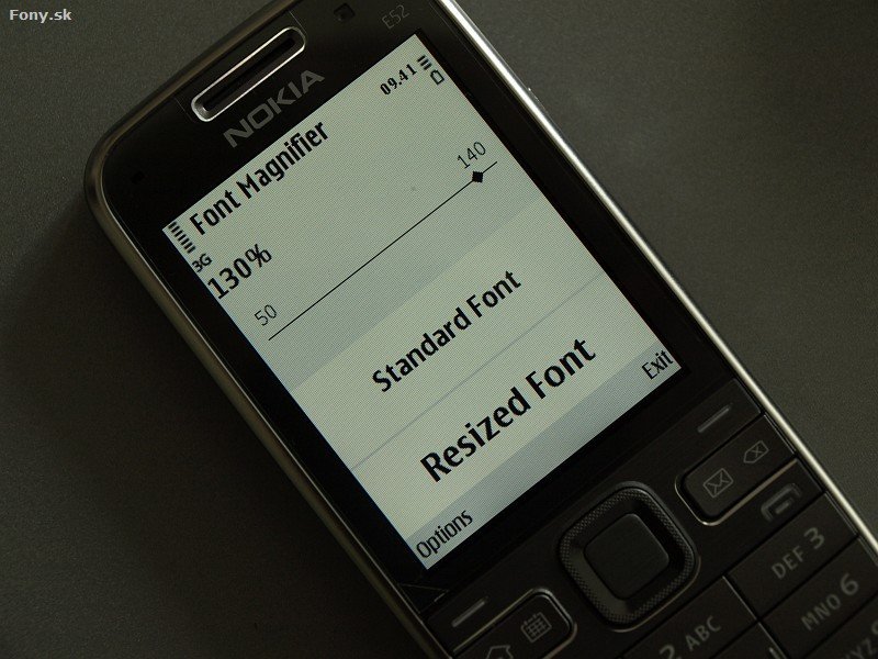 , známy hlavne z modelov vyššieho radu - E71 a E75. Konečne sa teda aj nižšia trieda dočkala kvalitného displeja, vhodného aj na plnohodnotnú navigáciu. Takmer dva-a-pol palcový displej s rozlíšením 240 x 320 bodov je dostatočný a fotografie či písmo zobrazuje jemne. Farby sa mi však zdali sýtejšie než na E71. Zrejme to však bolo spôsobené graficky upravenými v novej verzii operačného systému. Pohotovostný režim si môžete klasicky prispôsobiť a prepínať medzi firemným a osobným režimom. S hlavným displejom si môžete prepojiť aj viacero aplikácií: úlohy, rádio, vyhľadávanie či kalendár. E-mailová schránka je taktiež prepojená s pohotovostným režimom, a tak na hlavnej obrazovke vidíte koľko nových neprečítaných správ na vás čaká. Pohotovostný režim Symbianu som si obľúbil aj kvôli pomocou priameho zadávania znakov (podľa slovníka T9). Menu telefónu pozostáva zo štyroch riadkov po tri ikony (alebo opačne, po otočení telefónu akcelerometer otočí obrazovku na šírku). Rôzne aplikácie sú prehľadne zoradené do kategórií pracovňa, ovládací panel, média a aplikácie, ale nechýba ani zoradenie funkcií do vlastných priečinkov. Nastavenia displeja umožňujú regulovať jeho jas, nastaviť odklad šetriča obrazovky či veľkosť písma. Okrem troch štandardných veľkostí si môžete veľkosť fontu telefónu zmeniť aj pomocou aplikácie . Tá vám zmení písmo telefónu podľa navolených percent (50 - 140 %). Pripravené sú aj tri grafické témy, ktoré používajú veľmi jednoduchú a nerušivú grafiku. Pre zrýchlenie reakcií telefónu odporúčam v témach vypnúť grafické efekty. Zaujímavé sú aj zvukové témy, ktoré vám zmenia kompletný zvukový prejav telefónu (vyzváňací tón, zvuk vybratia pamäťovej karty, upozornenia...). v Eseries nikdy nevynikal svojimi funkciami. Prvým pokrokom bolo zavedenie LED blesku, autofókusu a dostatočného počtu megapixelov v Nokii E71. Novinka pokračuje v tomto novozaužívanom štandarde, no bez prítomnosti autofókusu. Trojmegapixelový fotoaparát s prisvetľovacou diódou robí fotografie priemernej, miestami až podpriemernej kvality s jemným nádychom dofialova. Fotografovanie prebieha na šírku, nastavenia umožňujú (de)aktivovať blesk, vybrať si niektorý z režimov či kvalitu a veľkosť fotografie. Podporovaný je aj sekvenčný režim a panoráma. Panel nástrojov počas fotografovania môžete aj vypnúť alebo prispôsobiť. Na fotografovanie môžete využiť aj prednú kameru. Zabudovaný modul GPS dokáže zapísať súradnice do fotografie. Zvuk spúšte sa už tradične nedá vypnúť. LED blesk je mierne fialový, a tak pri fotografovaní dokumentov dokáže aparát takmer dokonale softvérovo odstrániť fialový fľak typický pre ostatné fotoaparáty v Nokiách. Pri režime videa je možné nahrávať ho so zapnutou prisvetľovacou diódou. Video nahráva v režime MP4, možnosti nastavenia sú podobné ako pri fotoaparáte. Nedajte sa nalákať možnosťou panorámy vo videu, kamera sa automaticky prehodí na fotoaparát. je iné než to, na ktoré ste boli doteraz v symbianovských Nokiách zvyknutí. Nová galéria vám zoradí snímky podľa kategórií "nasnímané, mesiace, albumy, menovky, načítania, zdieľanie online". V kategórií "nasnímané" nájdete všetky odfotografované snímky, menovky zasa slúžia na rozdelenie fotografií podľa vami zadaných charakteristických výrazov. Snímky v galérii sú zoradené podľa dátumu v ovále miniatúr. Po vybratí miniatúry sa obrázok roztiahne na celú obrazovku. Akcelerometer vám uľahčí otáčanie snímok pri prezeraní na šírku. Panel nástrojov pri prezeraní je možné ukryť. Fotografie si môžete vložiť aj do prezentácie, kde si môžete vybrať taktiež hudbu do pozadia, dĺžku zobrazenia snímky či efekt prechodu. Nevýhodou celej galérie je nemožnosť približovania fotografií. Videoklipy môžete sledovať cez aplikáciu Videocentrum, ktorá vám vaše nahrávky roztriedi. Prezeranie videa na celú obrazovku je automatické, funguje aj rýchle pretáčanie.Knižnicu hudobného prehrávača je treba pred prvým (a každým aktualizovaním) obnoviť. Samotný hudobný prehrávač je na vysokej úrovni. Ponúka niekoľko druhov ekvalizérov, medzi nimi aj funkciu zosilňovača basov. Prehrávanú skladbu umožňuje nastaviť priamo ako zvonenie. Pri prehrávaní zobrazuje názov skladby, jej trvanie a obal albumu. Pri spustenom prehrávači som nebadal spomalenie reakcií. Aktuálna skladba s jej trvaním sa zobrazuje aj v pohotovostnom režime. Spomínaný 3,5 mm jack len prispieva k využitiu Nokie E52 ako hudobného mobilu. Prídavné stereo slúchadlá síce niesú špuntové a nepatria medzi tie kvalitnejšie, no vďaka konektoru jednoducho zapojíte vlastné a hudobný pôžitok sa ihneď dostaví. Pochváliť môžem aj reproduktor na zadnej strane, ktorý hrá taktiež pomerne kvalitne. Nevýhodou je jeho nižšia hlasitosť.