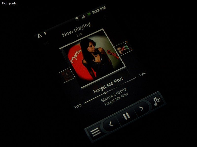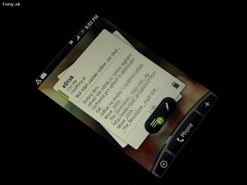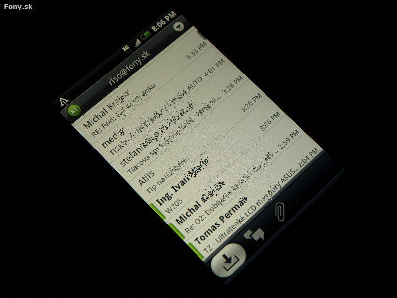 , ktorá vás zavedie do internetového obchodu s aplikáciami pre Android. V obchode sa nachádza údajne už viac ako 10 000 aplikácií, mnohé sú dostupné bezplatne. Ja som si do telefónu stiahol iba štyri aplikácie, a to: Battery widget - aplikácia, ktorá na domácej obrazovke zobrazuje počet percent batérie; Facebook for Android - mobilný klient, ktorý mi nahrádzal wapovú verziu; Gdocs - aplikácia, ktorá dokáže prezerať a sťahovať Google dokumenty a TasKiller - jednoduchý manažér bežiacich aplikácií, ktorý ich dokáže jedným klikom uzavrieť. V ponuke Marketu však nájdete obrovské množstvo bezplatných aplikácií, z ktorých si vyberie naozaj každý.Telefónny zoznam je riešený pomocou výbornej aplikácie People. Tá pri prvom spustení telefónu zosynchronizuje váš zoznam s kontaktami na SIM karte a Google kontaktami. Dodatočne, podľa e-mailových adries, dokáže zosynchronizovať údaje aj s Facebookom, Flickrom a Twitterom. Výsledný efekt je teda ten, že ku kontaktom sa priradí aktuálna fotografia, dátum narodenín a rôzne údaje, ktoré majú o sebe dané osoby uvedené na týchto weboch. Po otvorení kontaktu máte okamžitý prístup k jeho detailom, posledným konverzáciám cez SMS či mail a notifikáciách a albumoch na sociálnych sieťach. Prepojenie telefónneho zoznamu so stránkami ako Facebook, Flickr a Twitter si ma veľmi rýchlo získalo. Rovnako pri vytváraní kontaktu, pokiaľ sa nachádza osoba medzi vašimi priateľmi na Facebooku či Flickri, stačí ju len označiť a kontaktu sa automaticky pridelí dátum narodenia a fotografia. Škoda len, že sa narodeniny automaticky neuložia aj do kalendára. Pri vytáčaní čísla sa k telefónnemu zoznamu dostanete cez aplikáciu People alebo ťuknutím v spodnej lište na Phone. Na displeji sa objavia posledné volané čísla, nasledované telefónnym zoznamom s klávesnicou na vytáčanie, ktorá dokáže postupným zadávaním znakov (ako pri T9) inteligentne vyhľadávať kontakty. Počas hovoru ostáva displej odomknutý, takže si musíte dávať pozor na nechcené ukončenie hovoru. Pravdu povediac, s týmto neduhom som nemal ani jednu skúsenosť. Tlačidlom menu počas hovoru vstúpite do ponuky, v ktorej môžete napríklad aktivovať zadný reproduktor. Hlasitosť oboch reproduktorov je dobrá a dostatočná aj v hlučnom prostredí. Páči sa mi možnosť, že po ukončení hovoru na neznáme číslo telefón automaticky ponúkne jeho uloženie medzi kontakty.