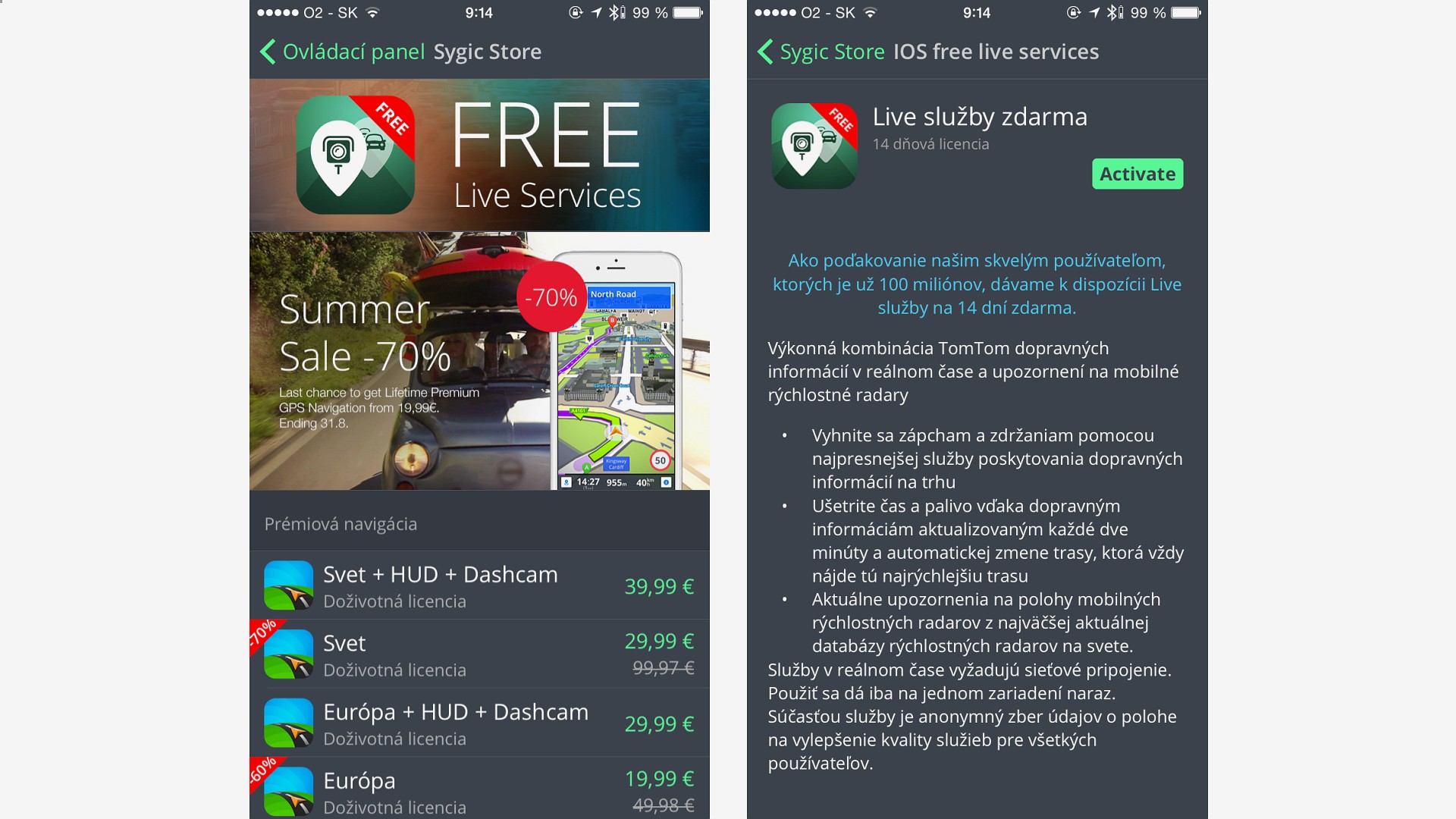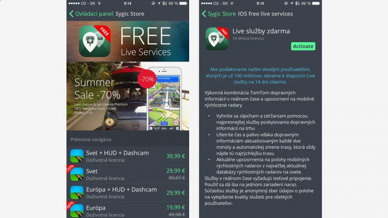 Ako poďakovanie dostanú zákazníci službu Live Services na dva týždne zadarmo. Stačí, keď si v telefóne otvoríte aplikáciu Sygic GPS Navigation a v ponuke Sygic Store aktivujete položku Live služby zdarma - kombináciu TomTom dopravných informácií v reálnom čase a upozornení na rýchlostné radary. Ponuka platí do 31. 8. 2015.