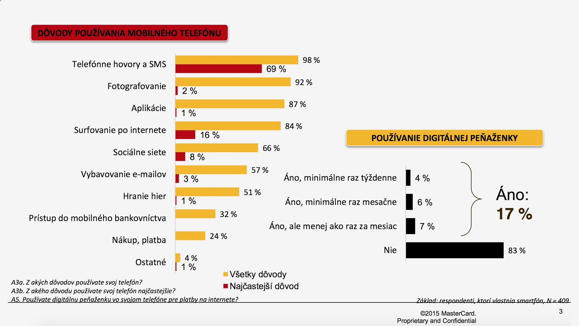 My sme sa pozreli hlavne na údaje o Slovákoch. Ako sa dalo očakávať, väčšina ľudí využíva svoj telefón na telefonovanie a písanie SMS správ, čoraz častejšie slúži mobil aj na fotografovanie a surfovanie na internete. Najviac je medzi smartfónmi zastúpený operačný systém Android (85 %), nasleduje Windows Phone (6 %) a tretím je iOS (4 %). Sociálne siete využíva 66 % respodtentov a 57 % z nich si na mobile vybavuje e-maily. Nasleduje hranie hier (51 %), používanie mobilného bankovníctva (32 %), nakupovanie a platenie (24 %). Digitálnu peňaženku využíva 17 % respondentov, z toho 4 % minimálne raz za týždeň, 6 % raz mesačne a 7 % menej než raz do mesiaca.