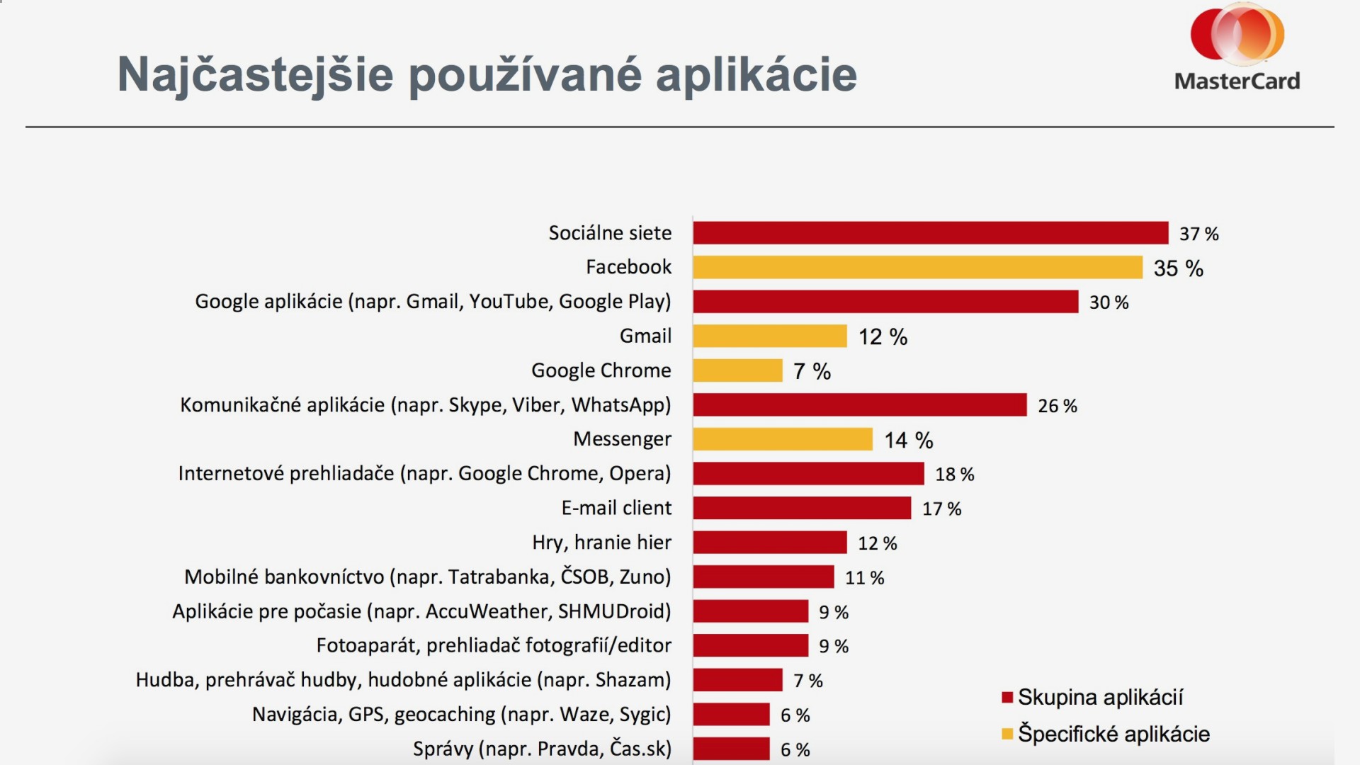 Aké aplikácie majú Slováci nainštalované v mobile? Nikoho zrejme neprekvapí, že vedú sociálne siete (37 %), nasledujú Google aplikácie (Gmail, YouTube…, 30 %), komunikačné aplikácie (napr. Skype, Viber, WhatsApp, 26 %), internetové prehliadače (18 %), e-mailový klient (17 %), hry (12 %), mobilné bankovníctvo (11 %) a menej než desiatimi percentami sú zastúpenené aplikácie pre počasie, hudbu, navigáciu a správy.