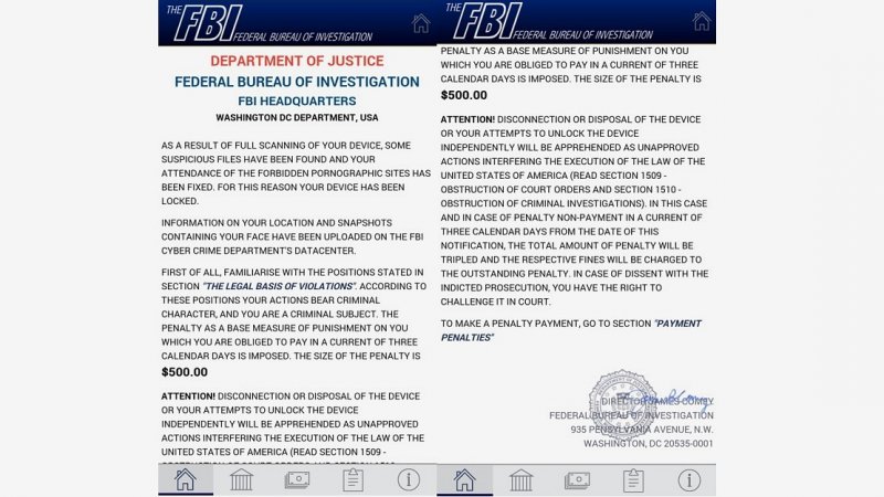 Krátko po inštalácii oznámi používateľovi, že si na zariadení prezeral a skrýval zakázaný pornografický materiál a musí zaplatiť 500 dolárov. Všetko fiktívne pod hlavičkou amerického Federálneho úradu pre vyšetrovanie (FBI).