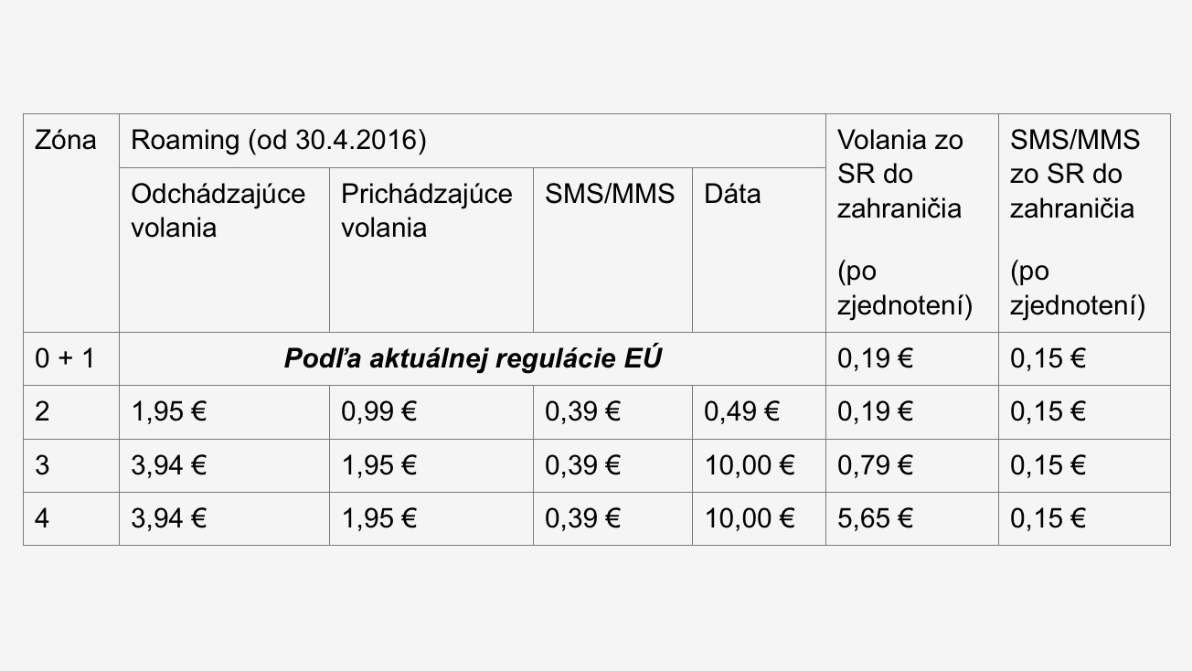 Operátor sa rozhodol zjednodušiť zákazníkom orientáciu v roamnigových zónach a zjednotí ich pre viaceré typy produktov. Po novom bude platiť princíp rovnakých zón pre paušály, predplatené karty i pevné linky. Prvá fáza sa zamerala na hovory, správy a dáta pri vašej ceste za hranice Slovenska. Či už napríklad voláte vy, alebo niekto vám. Zmena začne platiť k 30. apríli 2016.