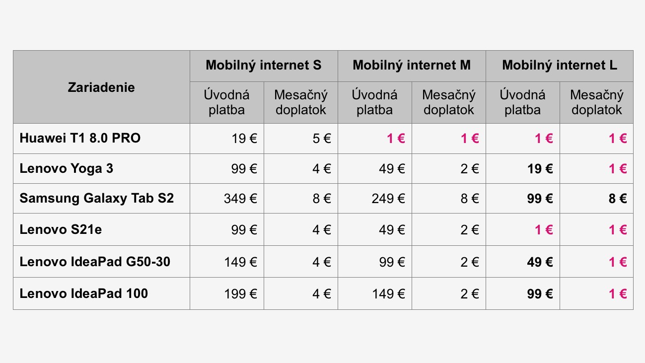Operátor bude naďalej ponúkať aj viaceré notebooky a tablety. Cena sa bude odvíjať od programu a bude zložená z dvoch častí, podobne ako pri Happy paušáloch: úvodnej platby a doplatku.