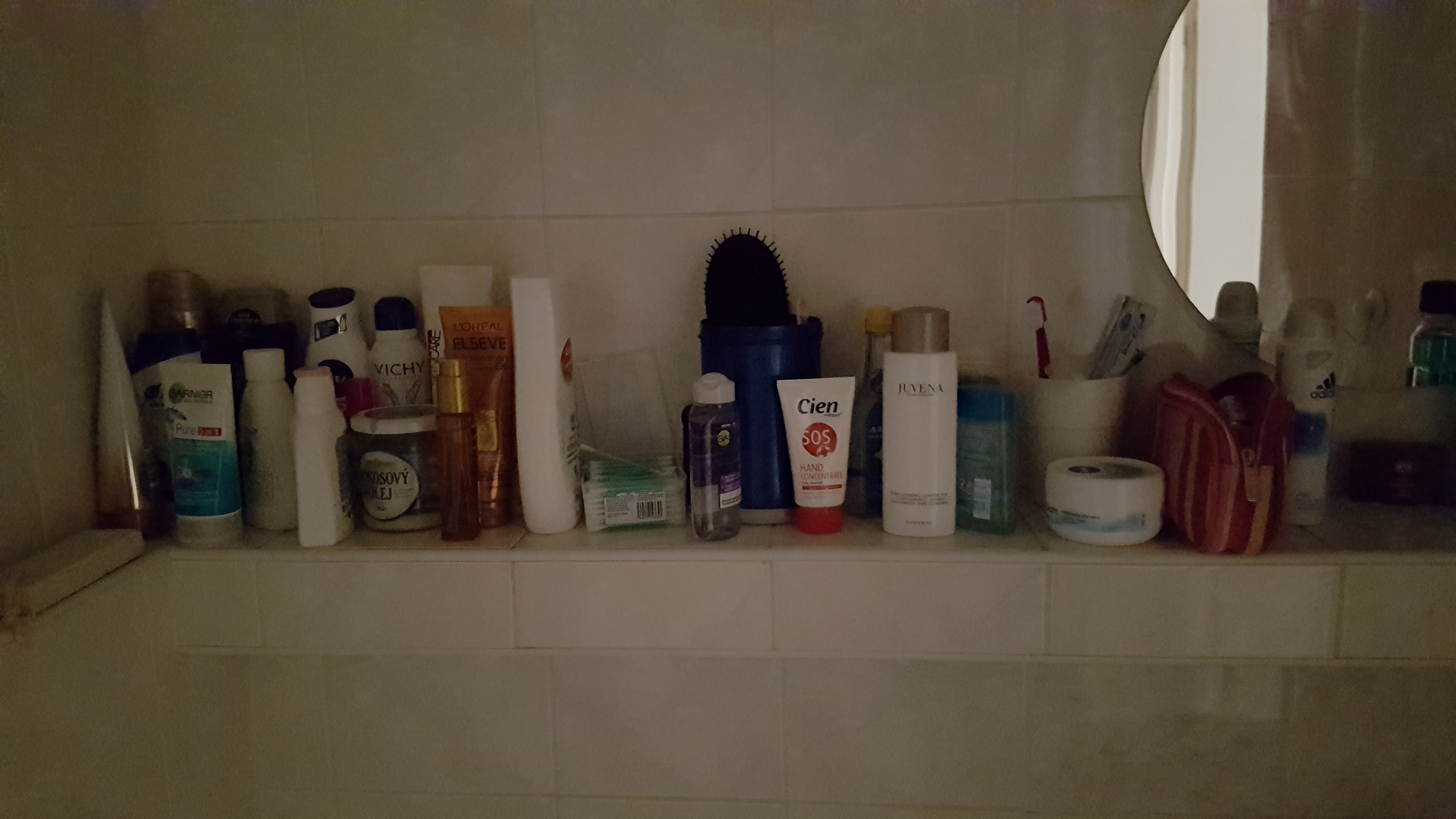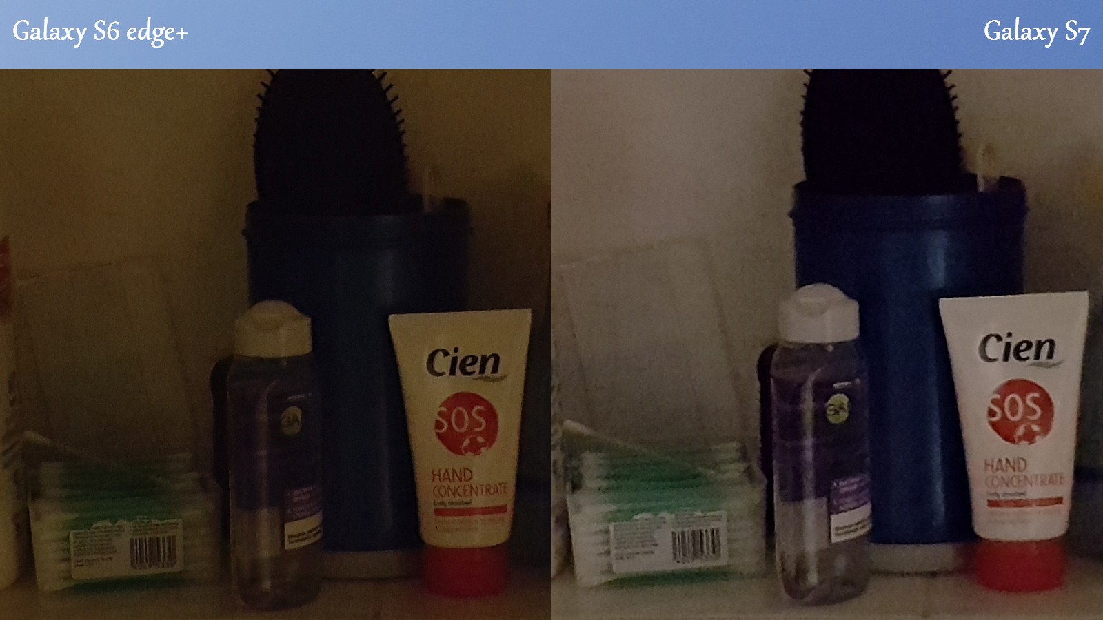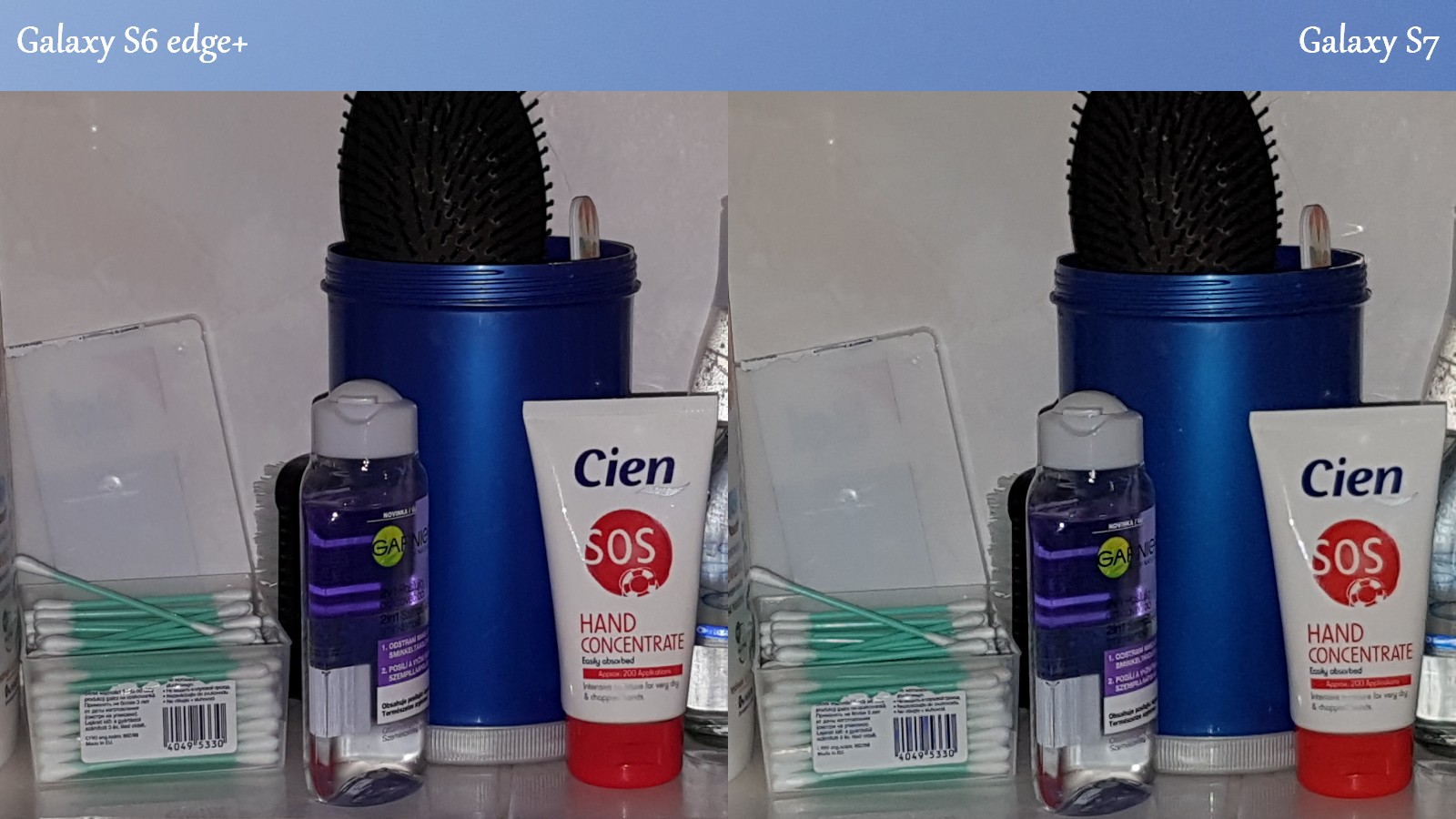 Ohnisková vzdialenosť oboch fotoaparátov je rovnaká, alebo veľmi podobná. Z rovnakého miesta tak odfotíte rovnaký priestor. Pri fotografovaní poličky v kúpelni som pri použití S6 aj S7 nemusel so statívom vôbec hýbať.