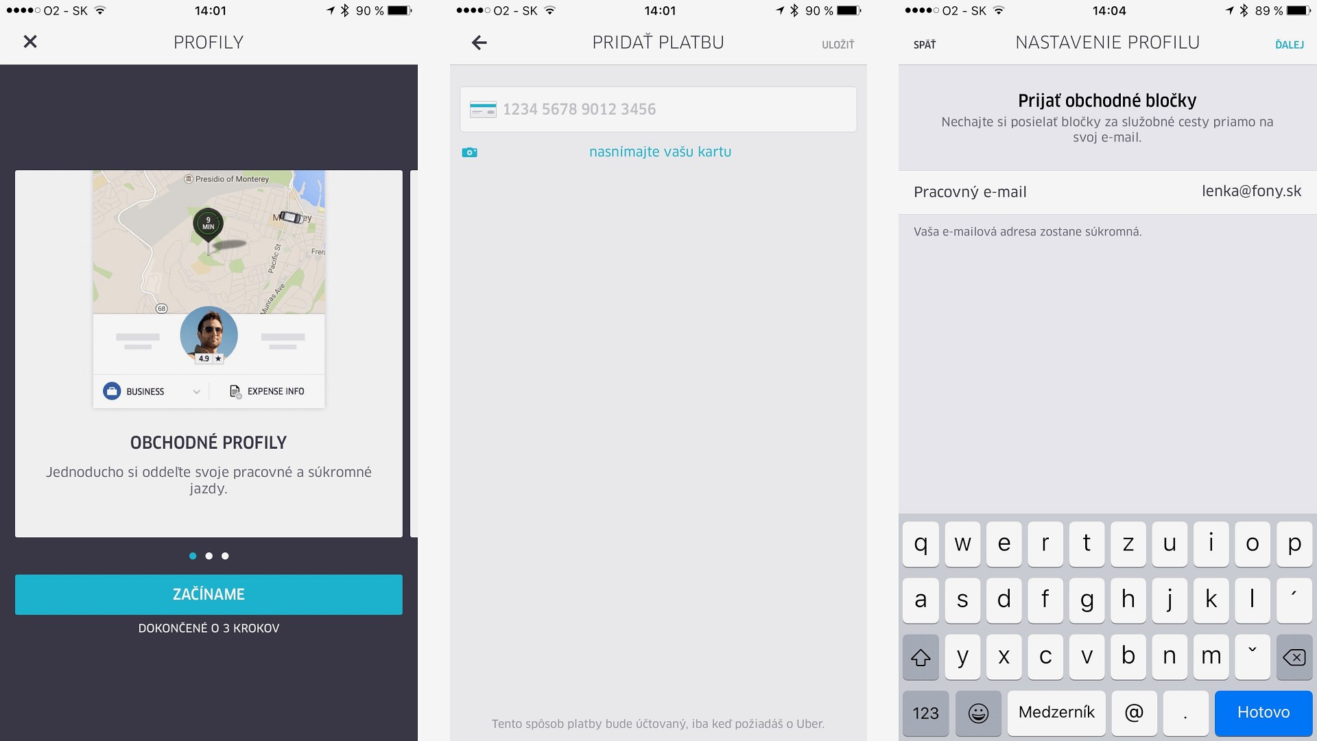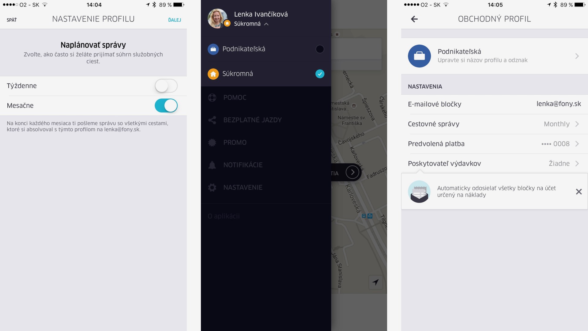 Firemný profil si vytvoríte v nastaveniach aplikácie. Pridáte si nový profil, platobnú kartu, ktorou budete za služobné jazdy platiť, vyplníte služobný e-mail a určíte si, ako často budete dostávať informácie o súhrne jázd vykonaných týmto profilom. Potom už len nezabudnite si pred každou cestou skontrolovať, aký profil tam máte aktuálne použitý. Ku každej jazde si môžete aj doplniť poznámku, napríklad účel cesty, meno klienta ku ktorému idete a podobne. Budete tak mať o všetkom prehľad.