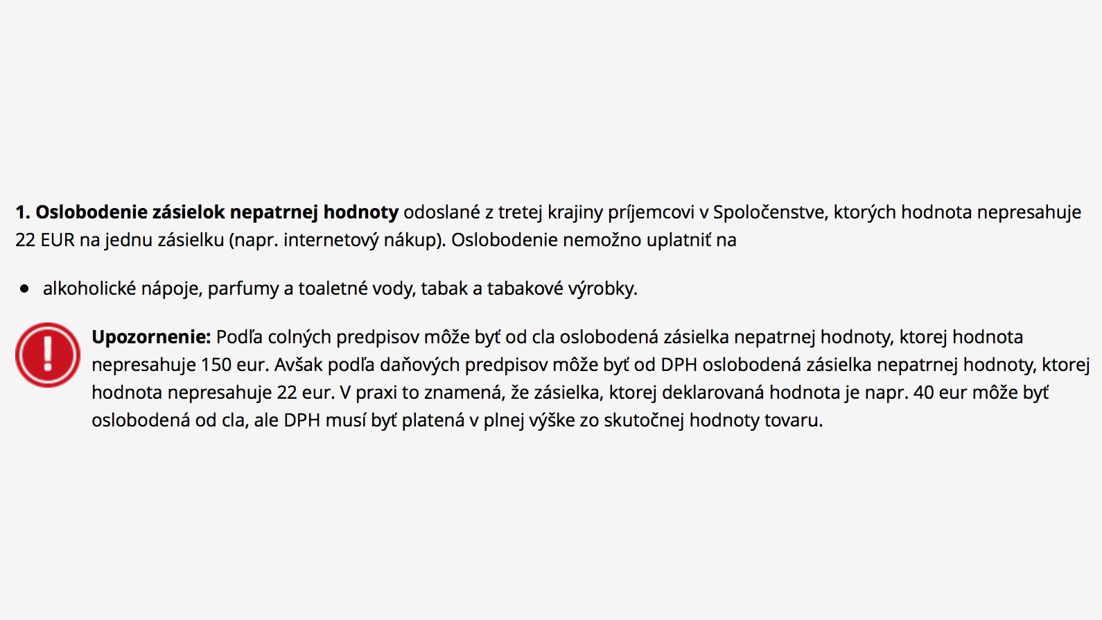 Zmena sa týka tovaru s colnou hodnotou vyššou než 150 eur. Čaká na vás vypisovanie colného prehlásenia. Budete posielať tovar späť k obchodníkovi a chcete vrátiť zaplatené colné poplatky? Musíte podať colné vyhlásenie pri vývoze. Za tovar s nižšou colnou hodnotou než 150 eur neplatíte clo, pokiaľ je však hodnota vyššia než 22 eur, plateniu DPH sa nevyhnete. Keď ale budete nakupovať napríklad parfémy, toaletné vody, alkohol či tabakové výrobky, zaplatíte clo aj vtedy, keď hodnota bude nižšia než 150 eur.
