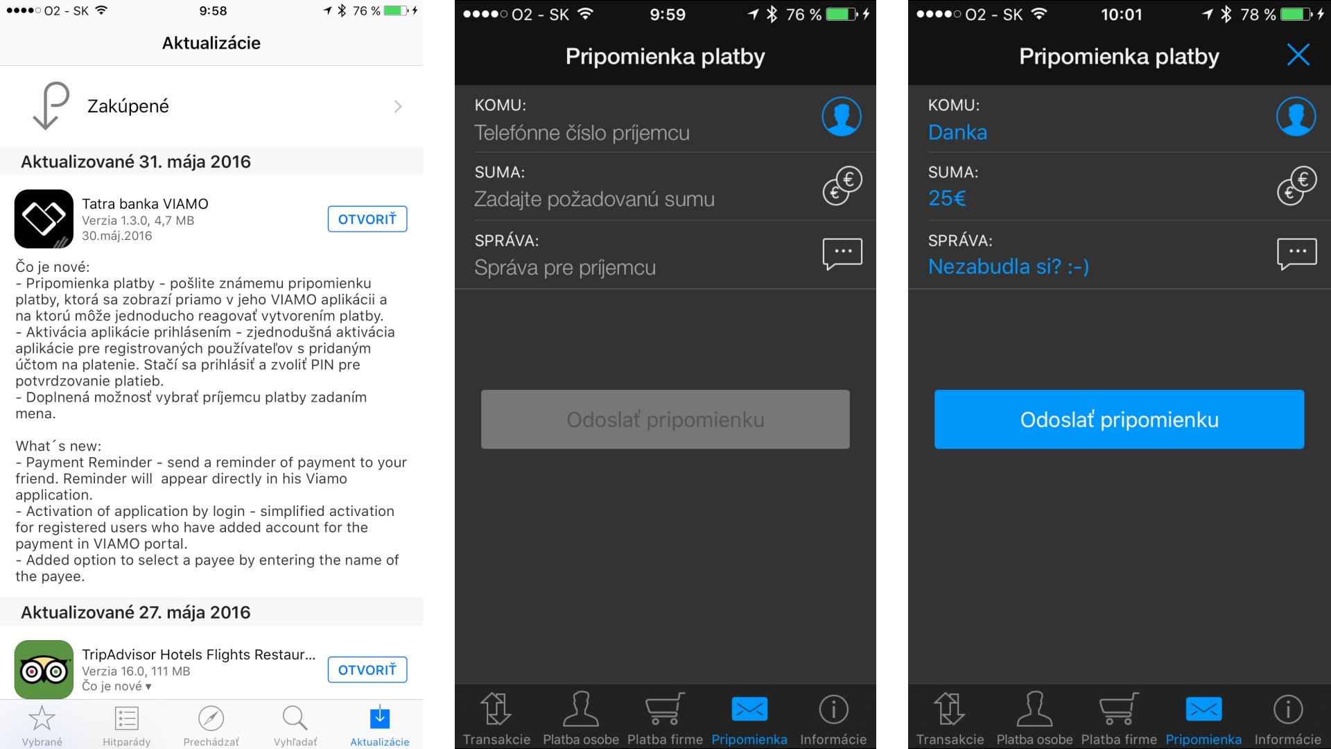 Zaslanie pripomienky je rovnako jednoduché ako platba, stačí zadať príjemcu, výšku sumy a prípadne popis. Príjemca je o pripomienke automaticky informovaný push notifikáciou. Môže na ňu reagovať vytvorením platby, ale aj zamietnutím pripomienky.