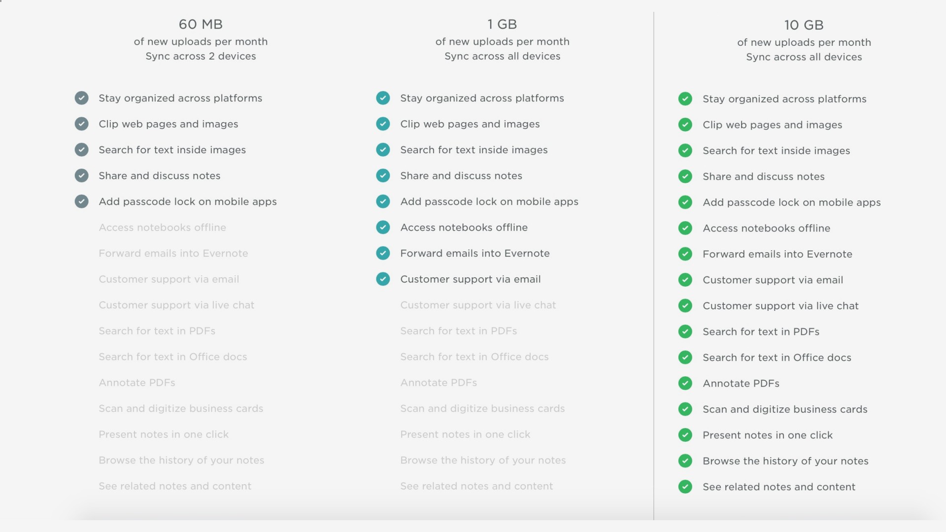 Platený Plus účet (29,99 € za rok alebo 3,99 € mesačne) ponúka navyše používanie poznámok v offline režime, 1 GB úložného priestoru, či preposielanie e-mailov do Evernote spolu s prílohami. Viac získate s účtom Premium (59,99 € za rok alebo 6,99 € mesačne), obsahuje 10 GB online priestoru, fulltextové vyhľadávanie, prezentačný režim, prácu s PDF súbormi, skenovanie vizitiek a podobne. Evernote aktuálnym používateľom ponúka pri prechode na platený účet 27 % zľavu z poplatku.