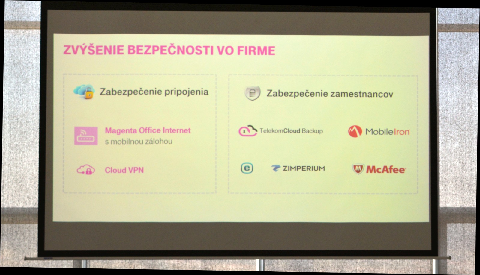 Telekom kladie veľký dôraz na bezpečnosť, preto ponúka službu Cloud VPN, ktorá umožní bezpečné dátové prepojenie pobočiek a mobilných zamestnancov a pevný Magenta Office Internet, ktorý zahŕňa záložný prístup cez 4G mobilnú sieť Telekomu.