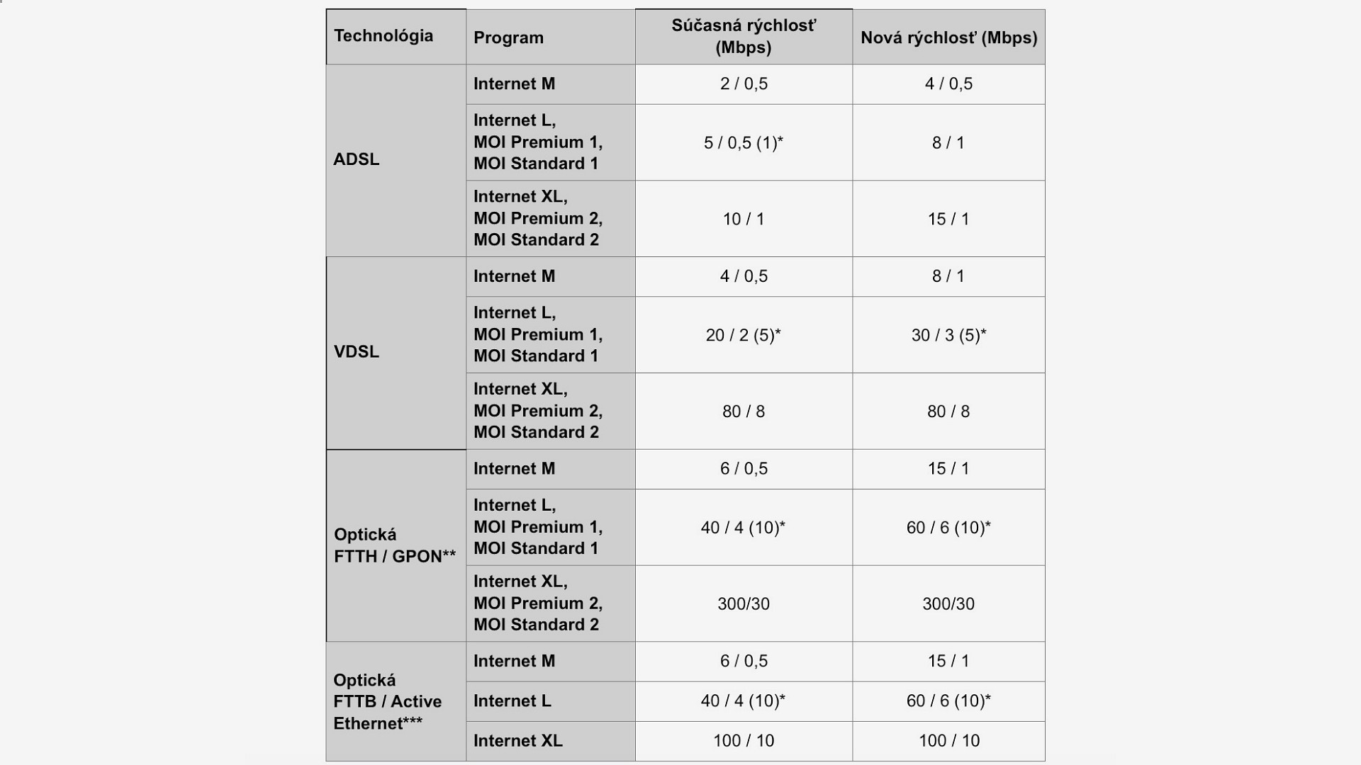 Nové rýchlosti v programoch Magio Internet a firemnom programe Magenta Office Internet (MOI) budú nasledovné: