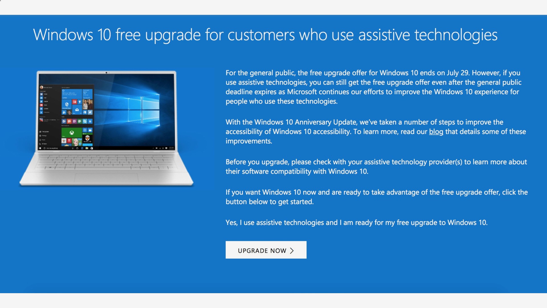 Napriek tomu, že bezplatný prechod na novú verziu oficiálne skončil v piatok 29. júla, záujemca o Windows 10 má stále možnosť bezplatnej inštalácie. Stačí, keď využije niektorú z asistenčných funkcií, napríklad pomôcku pre zrakovo či sluchovo postihnutých (lupu alebo čítačku). Microsoft nechce žiadne potvrdenie o tom, že patríte do tejto skupiny používateľov, a či sú pre vás asistenčné technológie potrebné, takže môže tento spôsob prechodu na novú verziu využiť každý.