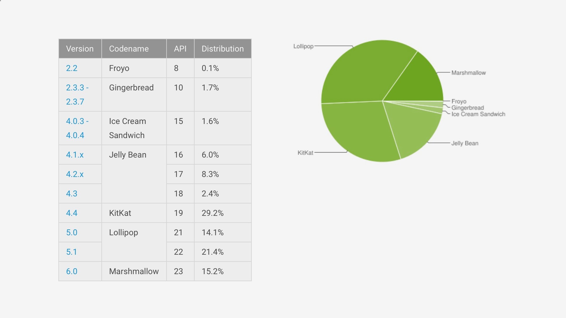 Najpoužívanejšou verziou je stále Android Lollipop (5.0 a 5.1), ktorému patrí 35,5 % podiel, starší 4.4 KitKat beží na 29,2 % mobilných zariadení. Tretím najpoužívanejším systémom nie je Android 6.0, ako by sme mohli očakávať, ale štvorročný Jelly Bean s 16,7 % podielom. Marshmallow patrí zatiaľ iba 15,2 %.